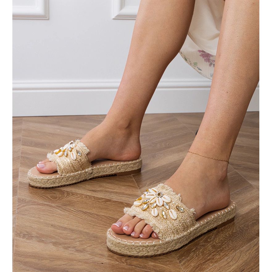 Les tongs dorés d'espadrilles avec des obus sont un incontournable dans la garde-robe de chaque femme à la mode, combinant le style et le confort. Leur couleur élégante et dorée attire l'attention et s'adapte parfaitement aux tendances estivales, ce qui fait que chaque stylisation gagne un caractère unique.