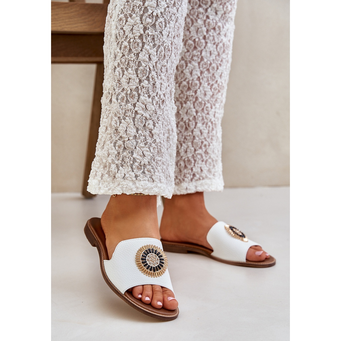 Détails: Lewski Shoes Les tongs en cuir avec décoration Lewski 3047 / o à thèmes plates blanc