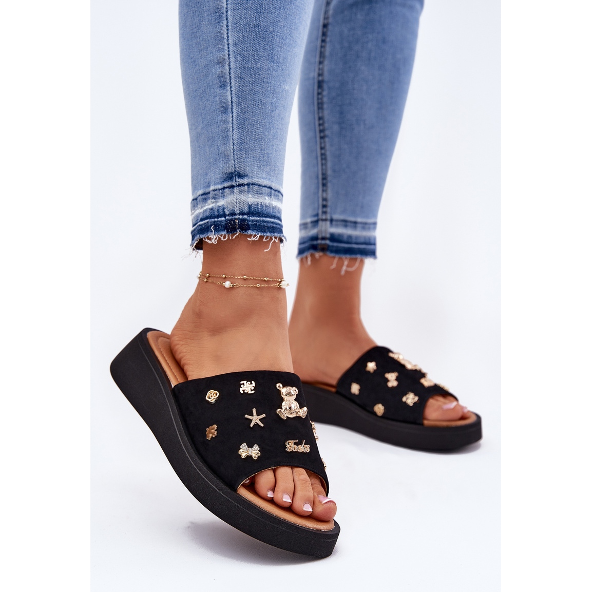 Grâce à la plate-forme de 3 cm de haut, ces tongs offrent de la stabilité et du soutien, ce qui en fait un excellent compagnon quotidien et pendant les sorties d'été. Les épingles à la mode dans la ceinture leur donnent un caractère unique, attirant leurs yeux et soulignant l'individualité du propriétaire.