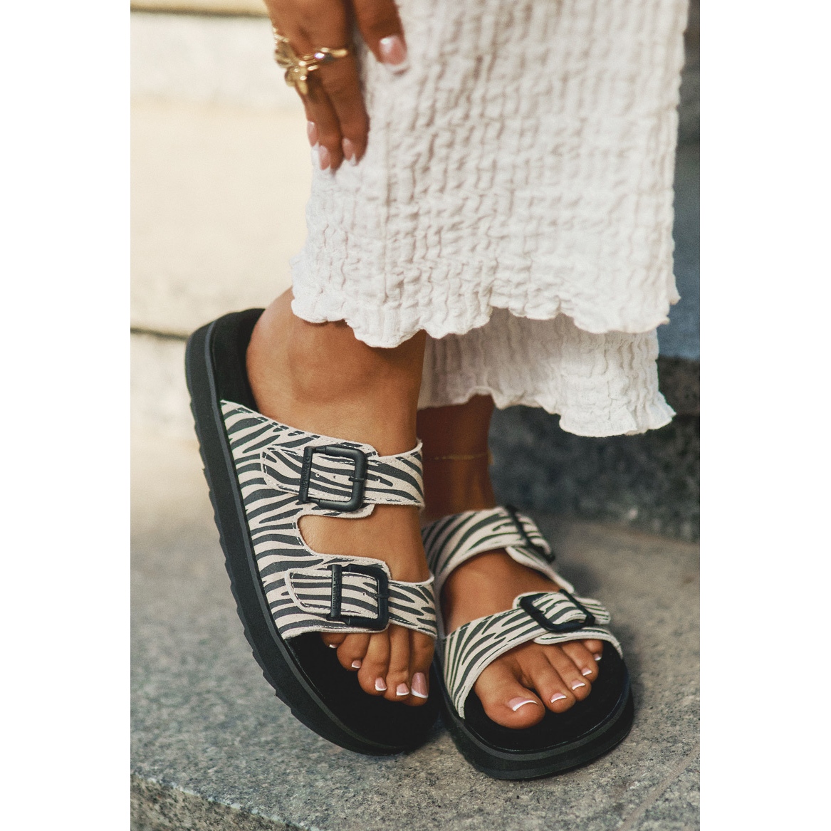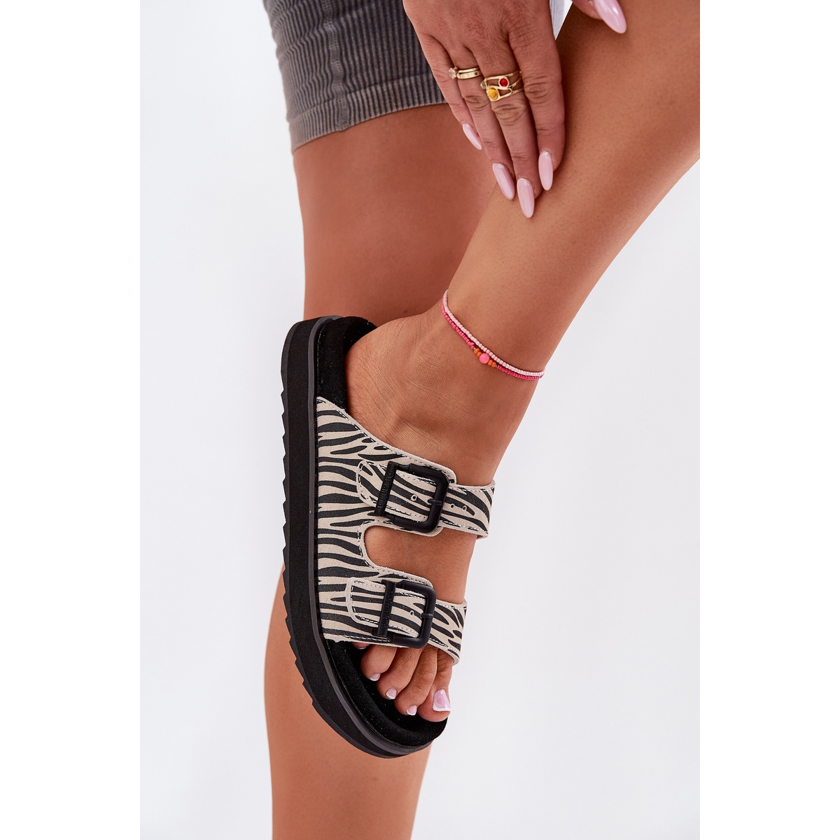 La marque de marque de la marque D.Franklin sous la forme d'un logo placé sur une boucle et un talon est un accent moderne qui se trouvera dans chaque stylisation. Ces tongs sont non seulement fonctionnels, mais aussi la mode, grâce à un motif animal qui ajoutera le caractère de toute création.