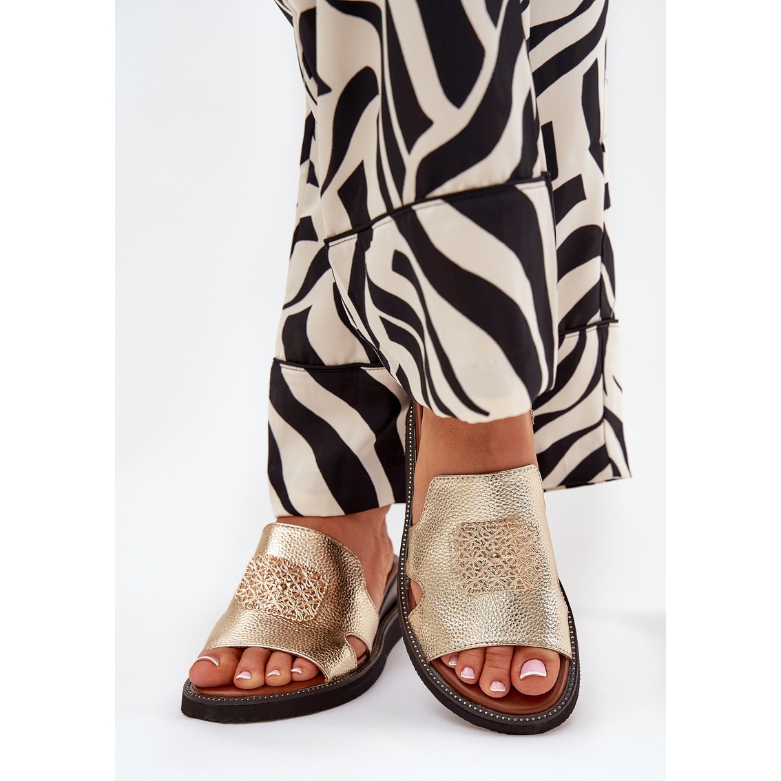 Les tongs pour femmes sur un coin en cuir écologique avec une décoration dorée sont un incontournable ce printemps et cet été. En combinant parfaitement le style moderne avec un confort extraordinaire, ces tongs sont créés pour les femmes qui apprécient l'élégance dans leur libération quotidienne.