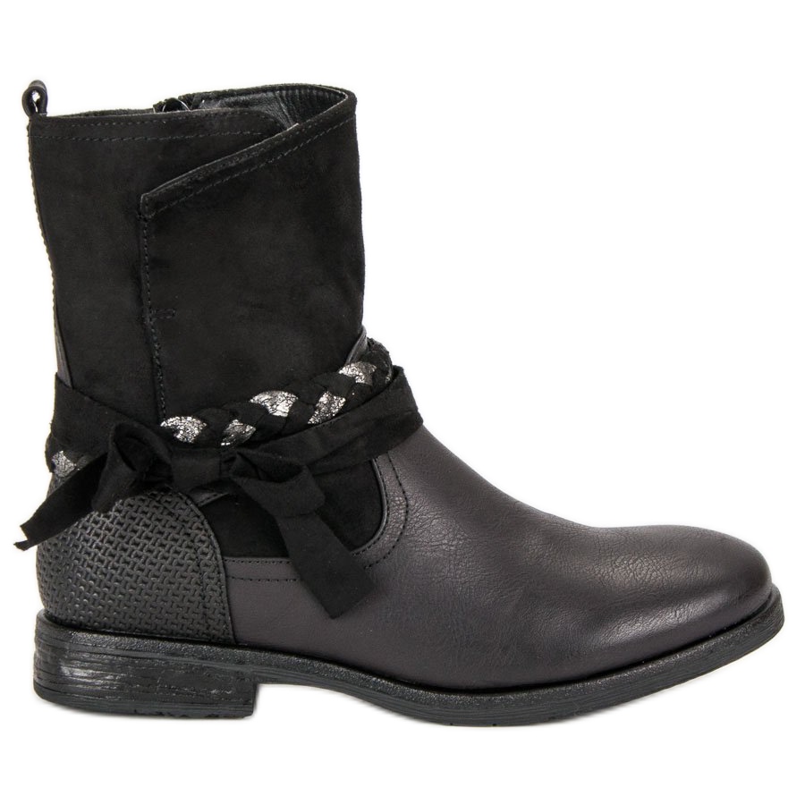 Les bottes de travail noires se distinguent par leur design inhabituel, qui allie sévérité et charme féminin. Une décoration intéressante à hauteur de cheville, sous la forme d'un galon textile noir et argenté avec un ruban en forme de noeud, leur confère un caractère original. Cela les rend parfaits pour les styles classiques et rock.