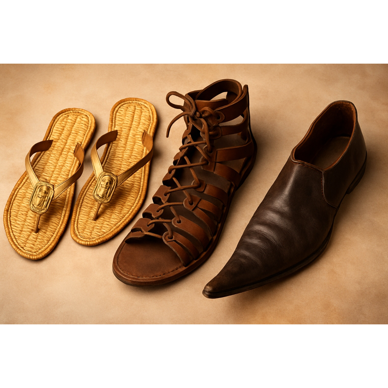 Dans l’Égypte ancienne, les sandales en papyrus tressé, en roseau ou en cuir étaient populaires. Leur forme et leur matériau dépendaient de la position sociale du propriétaire. Les pharaons portaient des sandales ornées d'applications dorées, tandis que les roturiers marchaient pieds nus ou en sandales simples. Les Égyptiens croyaient que les chaussures avaient une signification spirituelle et les plaçaient souvent dans les tombes comme équipement pour l'au-delà.