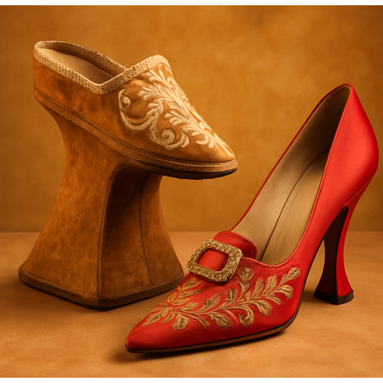 Au XVIIe siècle, le roi Louis XIV introduit la mode des talons rouges pour l'aristocratie. Sam mesurait seulement cinq pieds cinq et portait des talons hauts pour paraître plus grand. Les hommes et les femmes étaient également susceptibles de porter des chaussures décoratives à talons hauts, souvent richement décorées de broderies et de boucles. La couleur rouge était réservée exclusivement au roi et à son entourage immédiat.