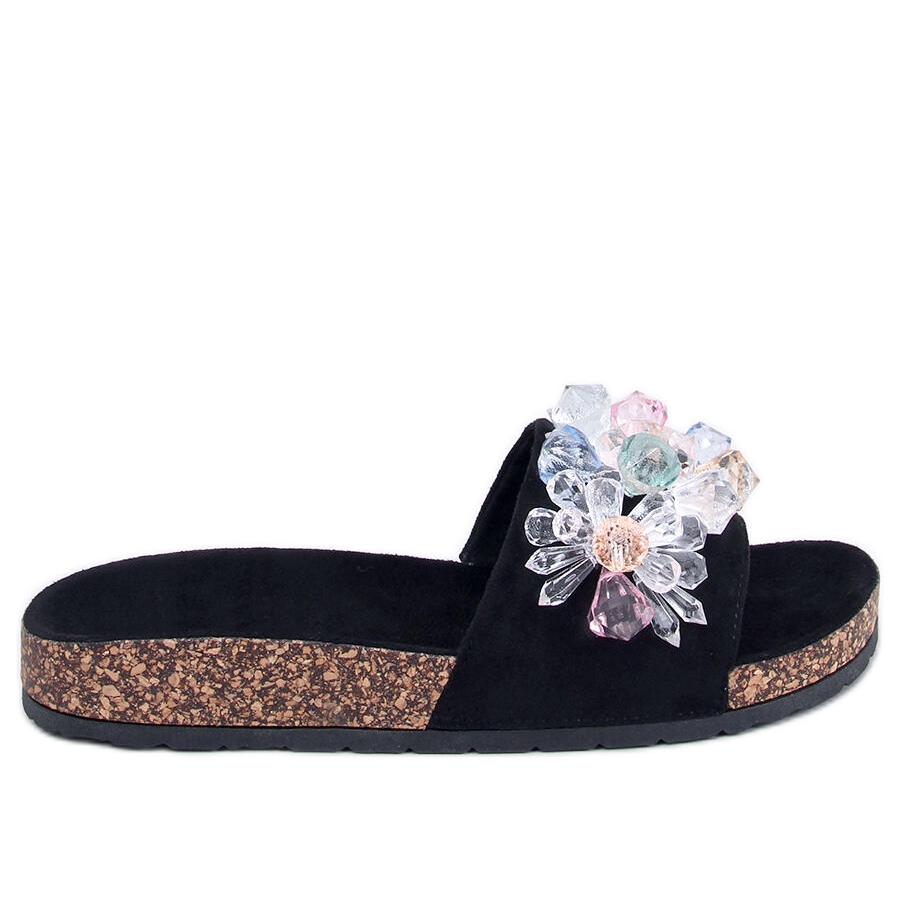 Découvrez nos élégants chaussons en liège avec pierres Maliv Black qui allient confort et style. Ces tongs noires pour femmes, montées sur une semelle en liège confortable, sont le choix parfait pour un usage quotidien. La bride en daim, ornée de cristaux brillants multicolores, leur confère un style unique, ce qui en fait un complément parfait à votre garde-robe.