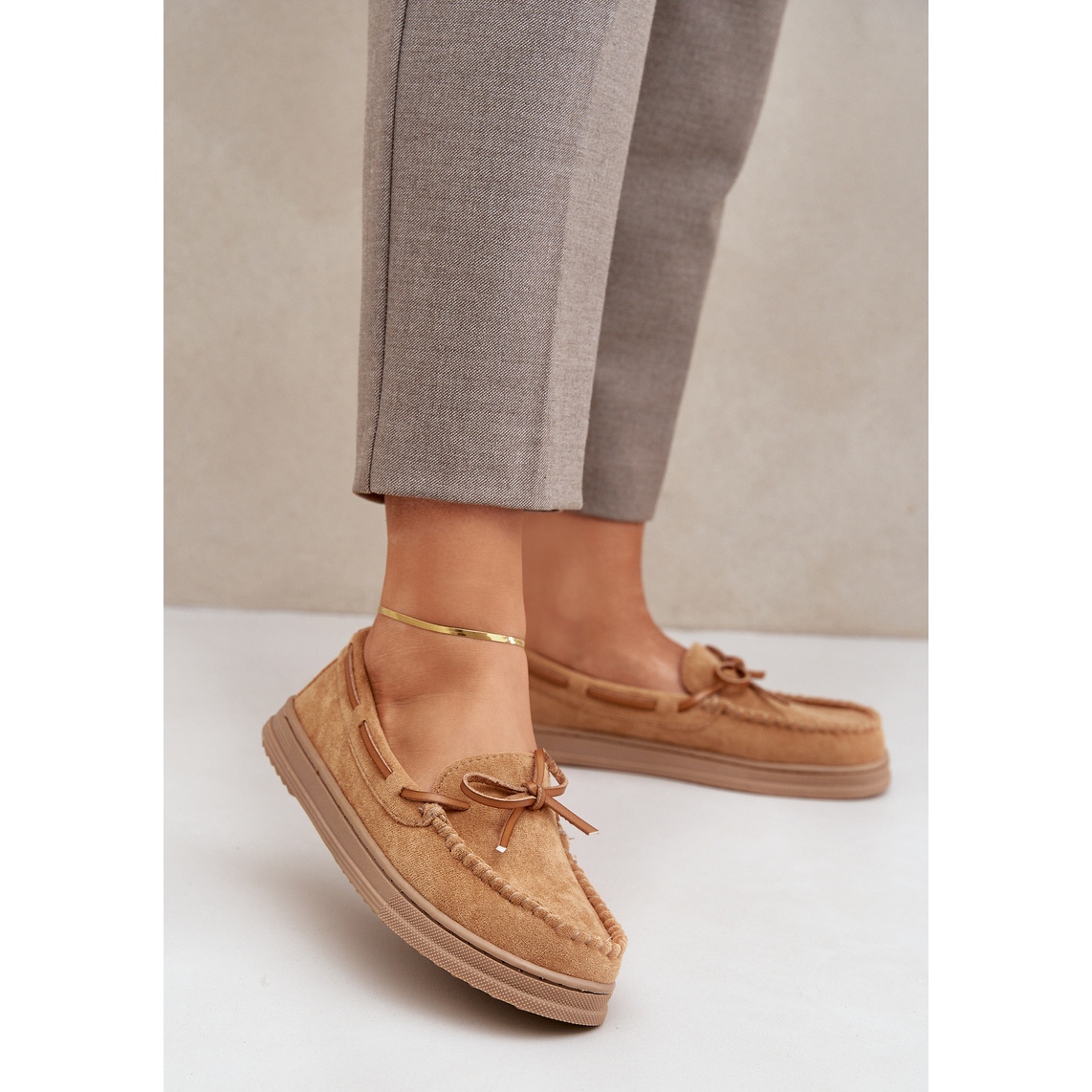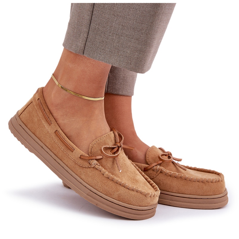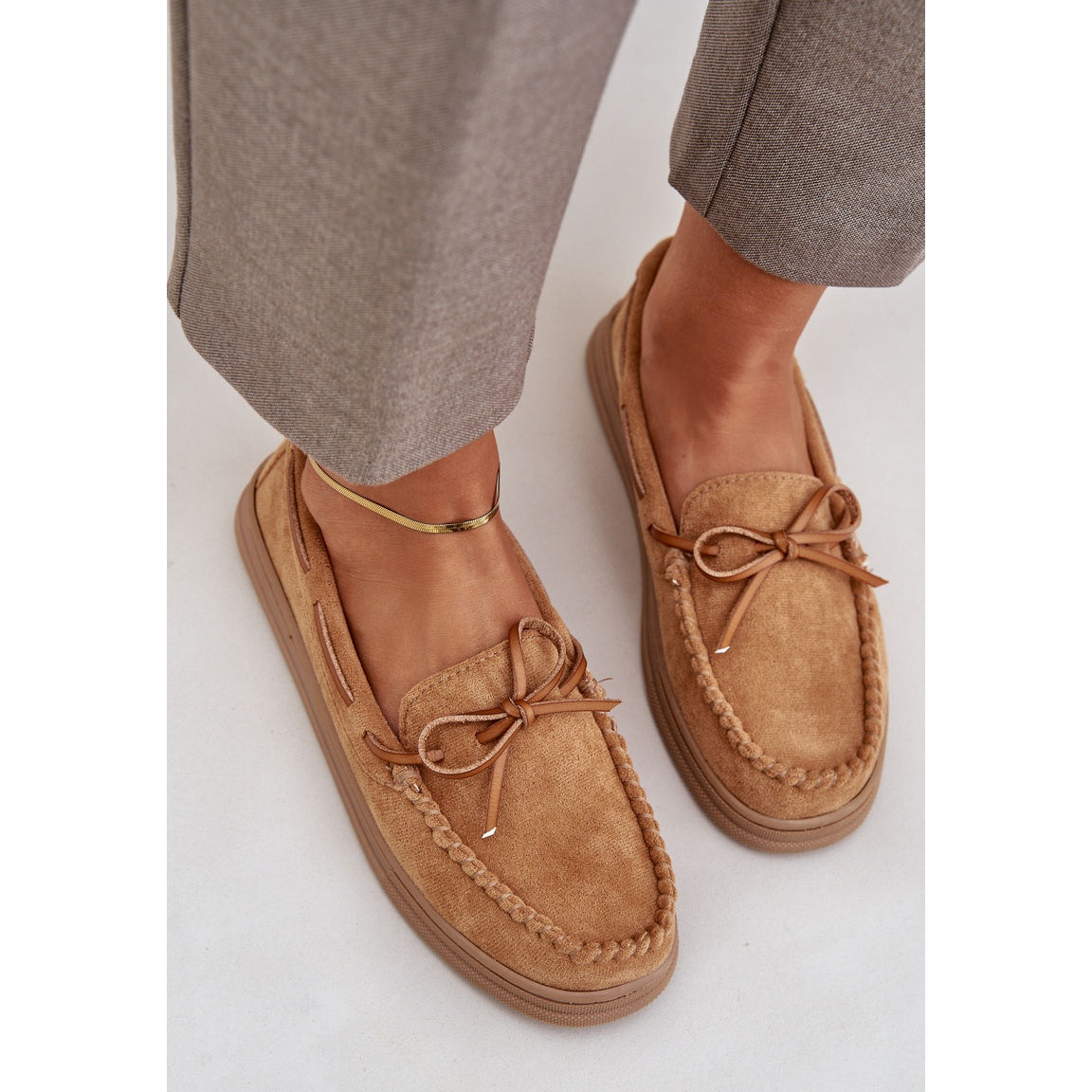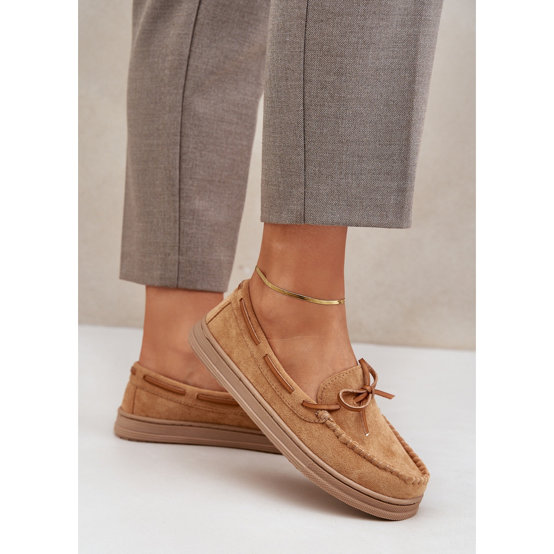 Un arc subtil placé à l'avant n'est pas seulement un accent élégant, mais aussi un ajout qui met l'accent sur la nature féminine des mocassins. Ils se mélangent parfaitement avec diverses stylisations - du décontracté à plus sophistiqué. Grâce à l'insertion, les mettre est extrêmement simple.
