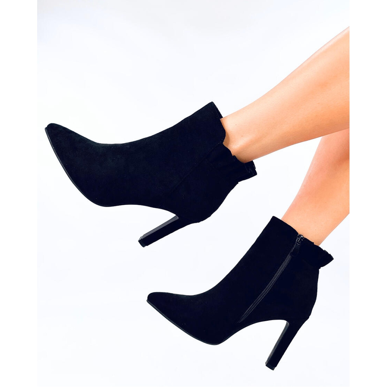 Bottines femme en daim à talon aiguille, hauteur 10 cm. Les chaussures se distinguent par une coupe soignée avec des bouts pointus délicats et un subtil volant en haut de la tige. Elles seront certainement parfaites pour les grandes occasions... Le modèle possède une fermeture éclair pratique sur le côté de la tige, qui permet de l'enfiler facilement. Ils sont fabriqués en daim écologique et l'intérieur est doublé de fourrure délicate.
