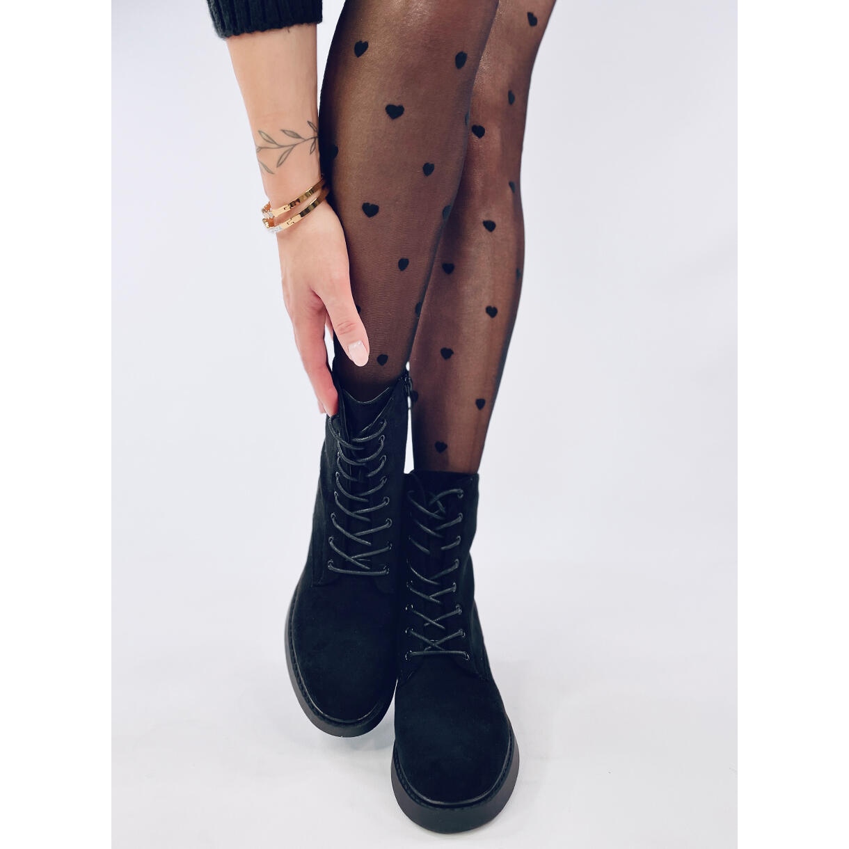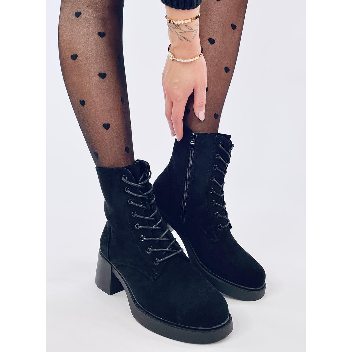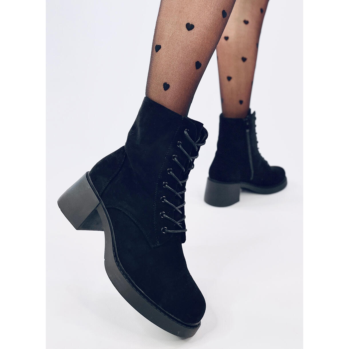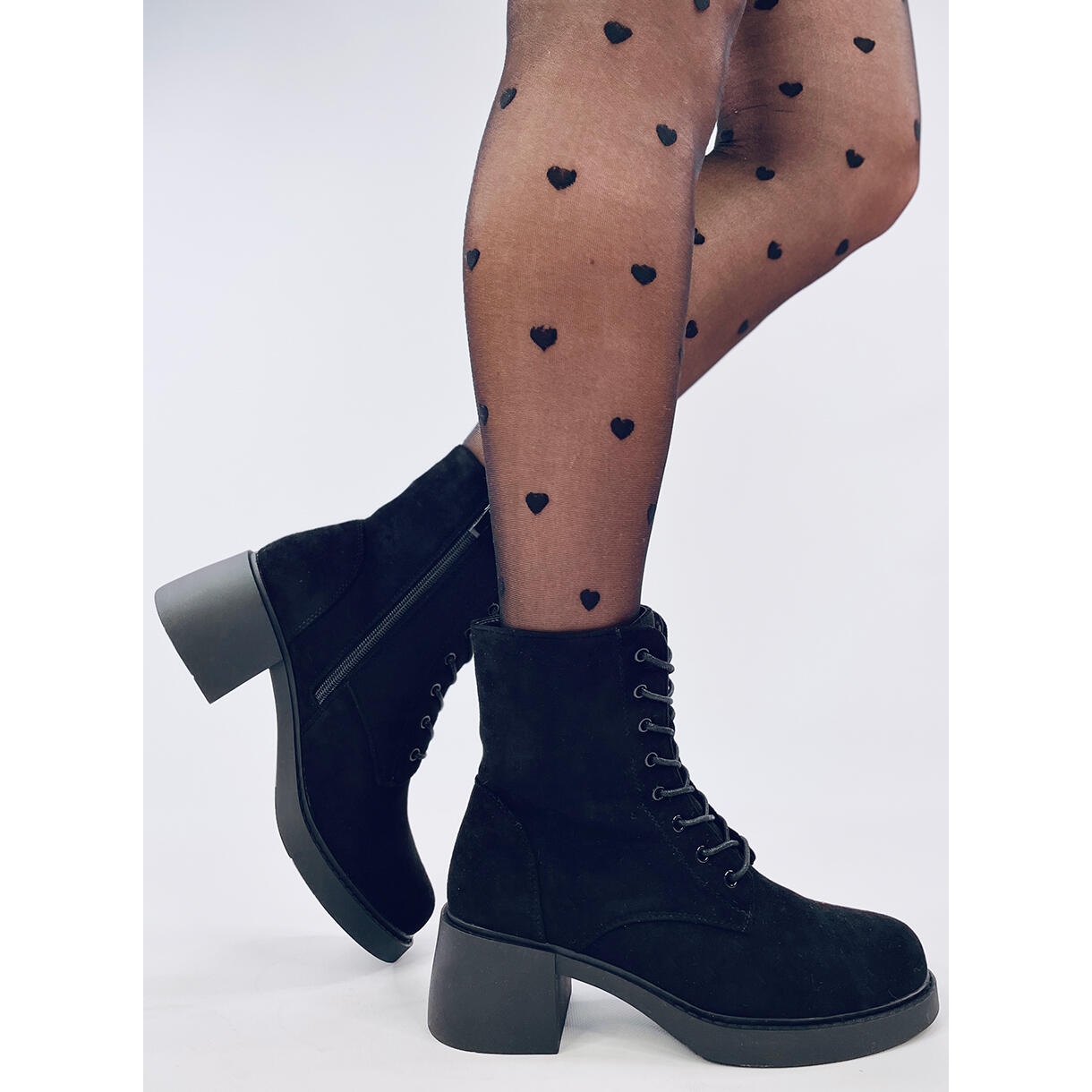 Les bottines à lacets pour femme sont des chaussures à talon large de 6 cm de haut. Ils sont noirs et fabriqués en daim écologique, doux au toucher et ajoutant un caractère élégant. Ils sont entièrement lacés, mais disposent également d'une fermeture éclair pratique pour un enfilage facile. L'intérieur des chaussures est doublé de fourrure douce pour plus de confort.