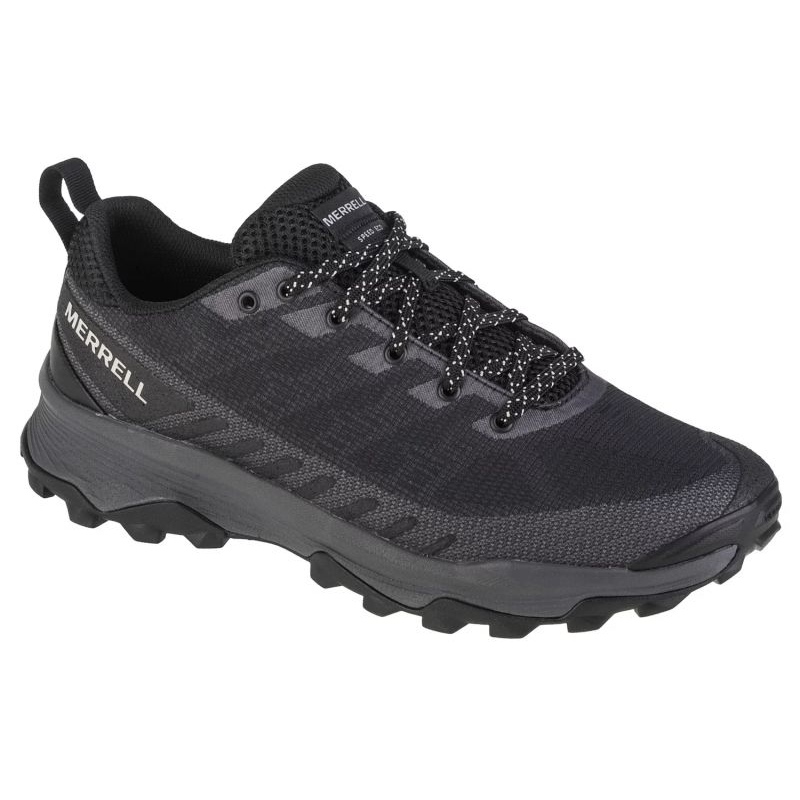 Chaussures modernes et faibles Merrell créées pour le trekking de montagne et les activités de plein air. La conception noire et modérée se combine avec des solutions pratiques: une tige durable faite de matériaux synthétiques, une doublure textile et une semelle solide avec une bande de roulement épaisse assure le confort et la stabilité sur un terrain inégal.
