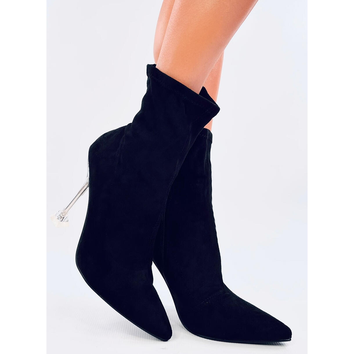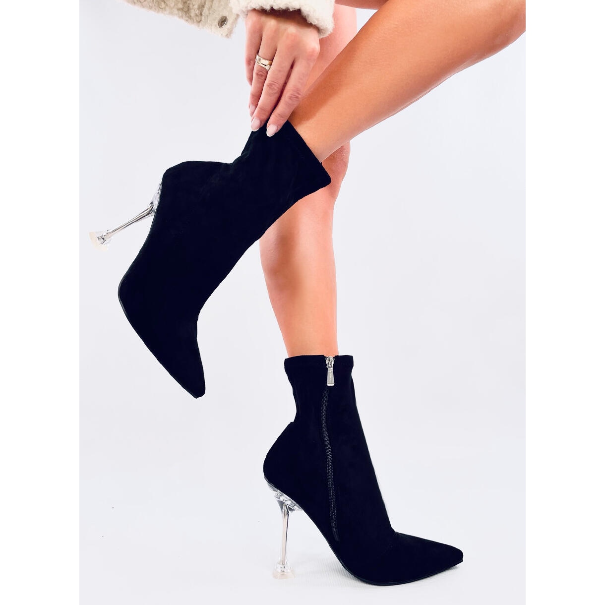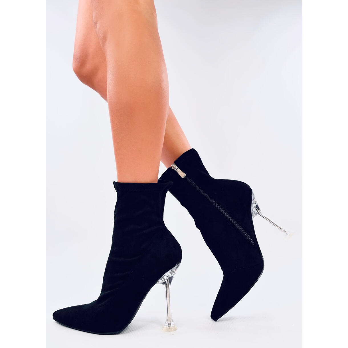 Les bottines pour femmes sont des chaussures élégantes en daim noir avec un talon aiguille haut et transparent de 11,5 cm de haut. Le talon ajoute de la grâce à la silhouette et attire l'attention. Le modèle se caractérise par une coupe soignée avec des bouts légèrement pointus. Les chaussures sont équipées d'une fermeture éclair, ce qui facilite leur enfilage. Ils n’ont pas d’isolation, ils sont donc parfaits pour les saisons plus chaudes.