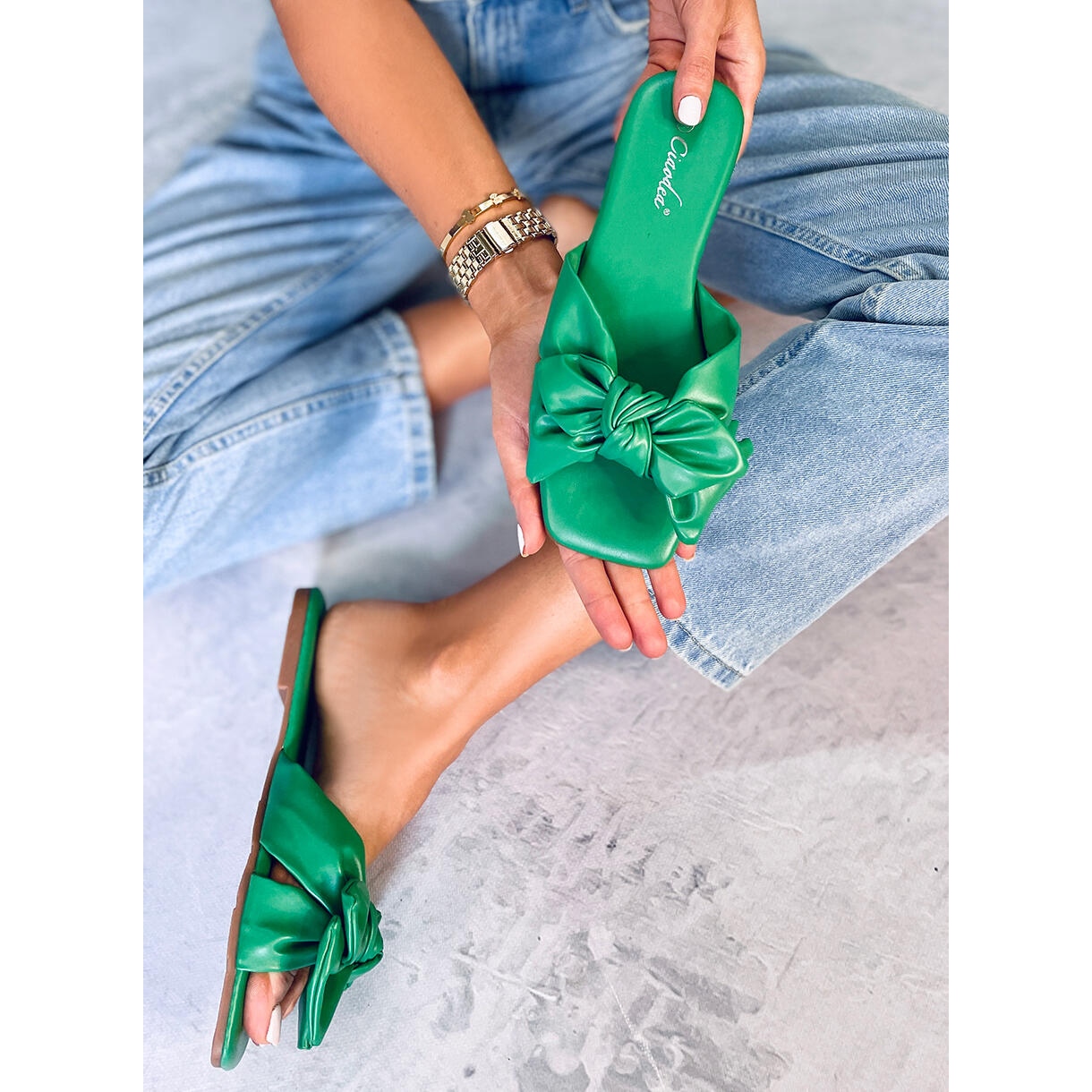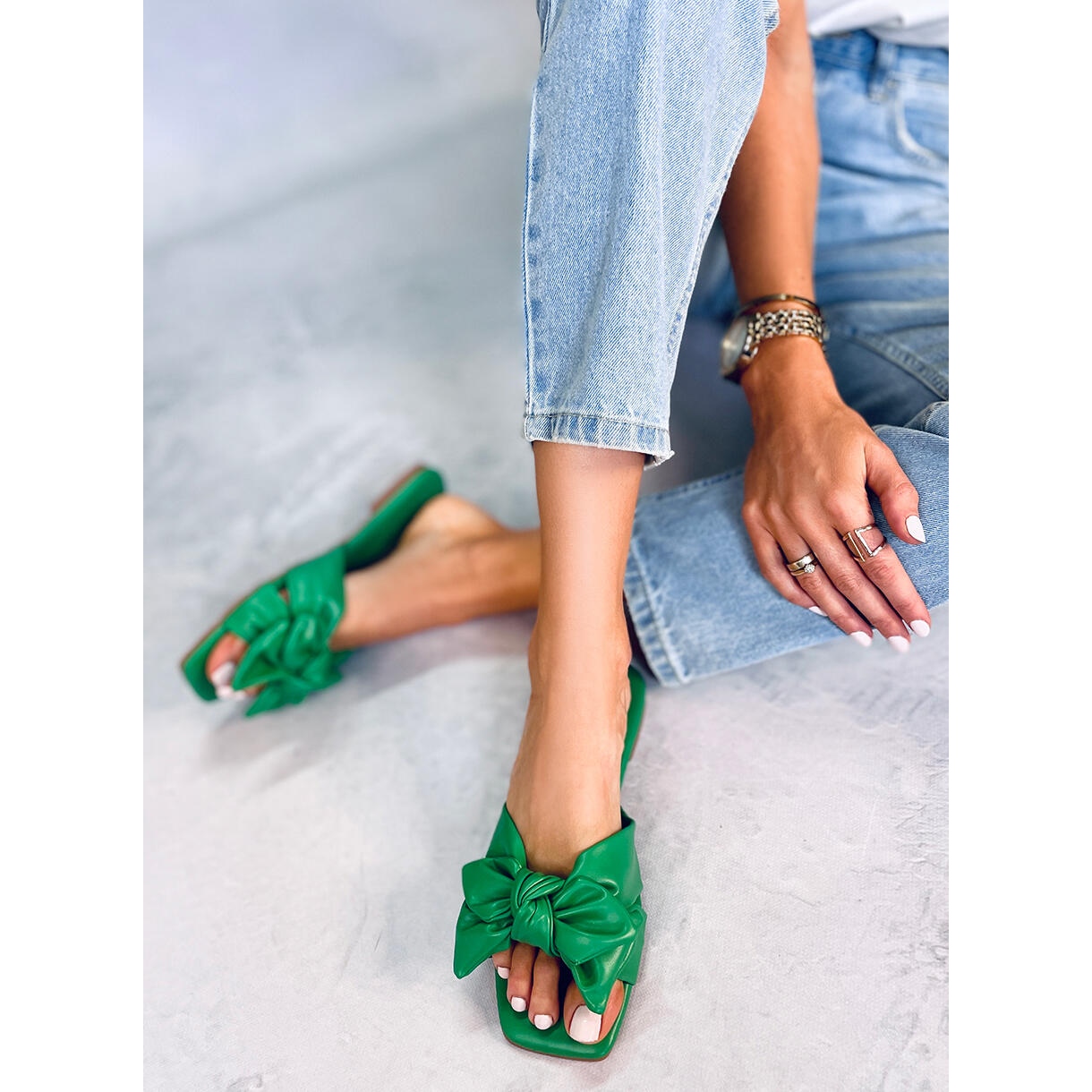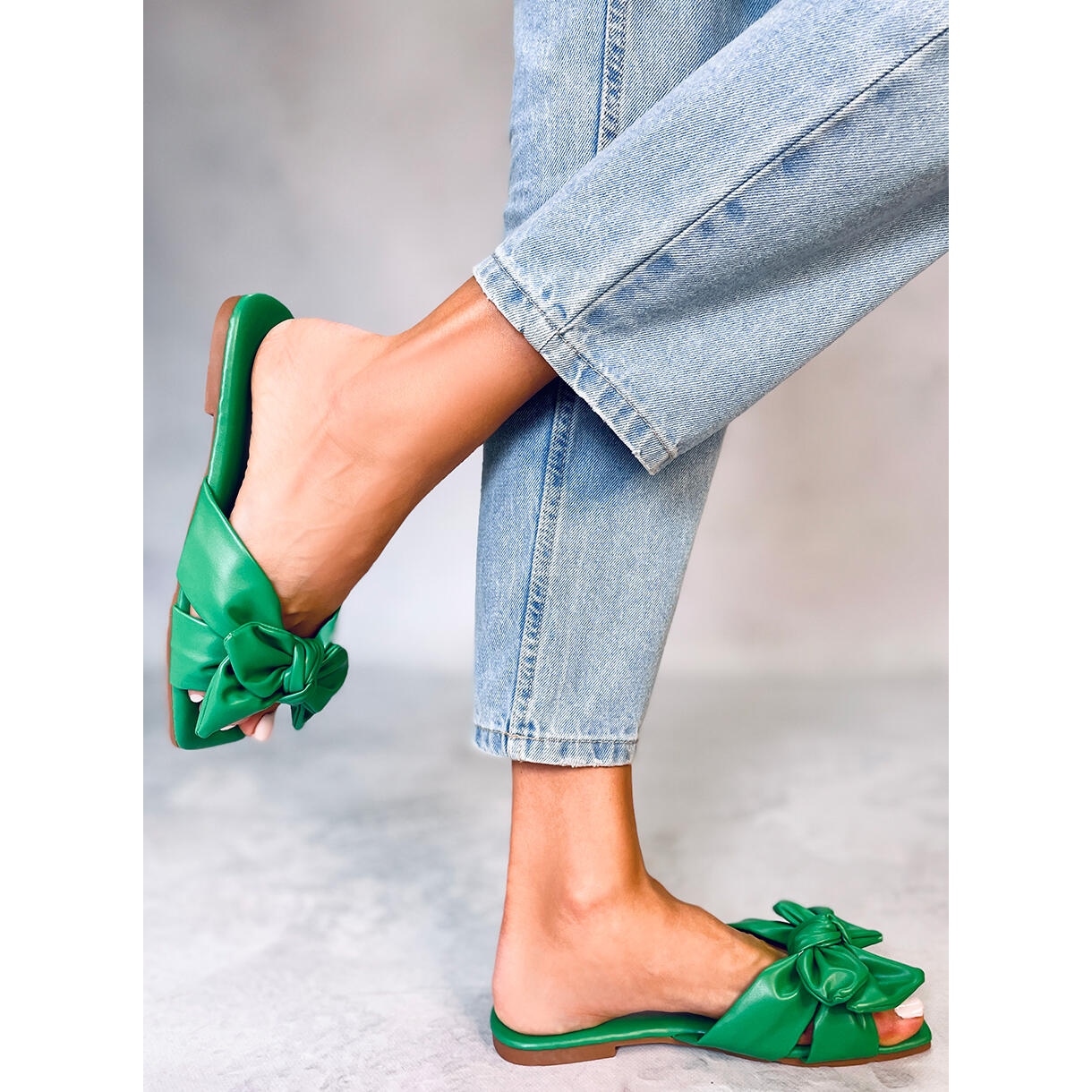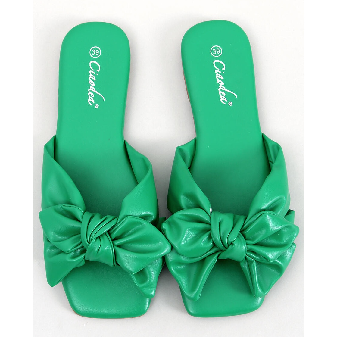 Nous vous présentons les tongs BM Minnen pour femmes dans une teinte verte tendance, qui deviendront certainement votre accessoire préféré au quotidien. Ces tongs plates se distinguent par un design moderne avec un bout carré et un charmant nœud, ce qui les rend non seulement pratiques, mais aussi extrêmement élégantes.