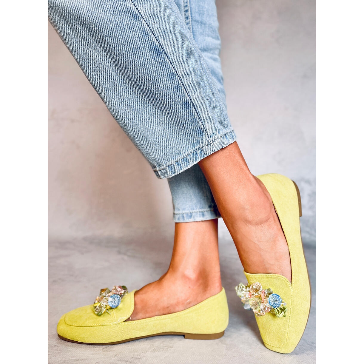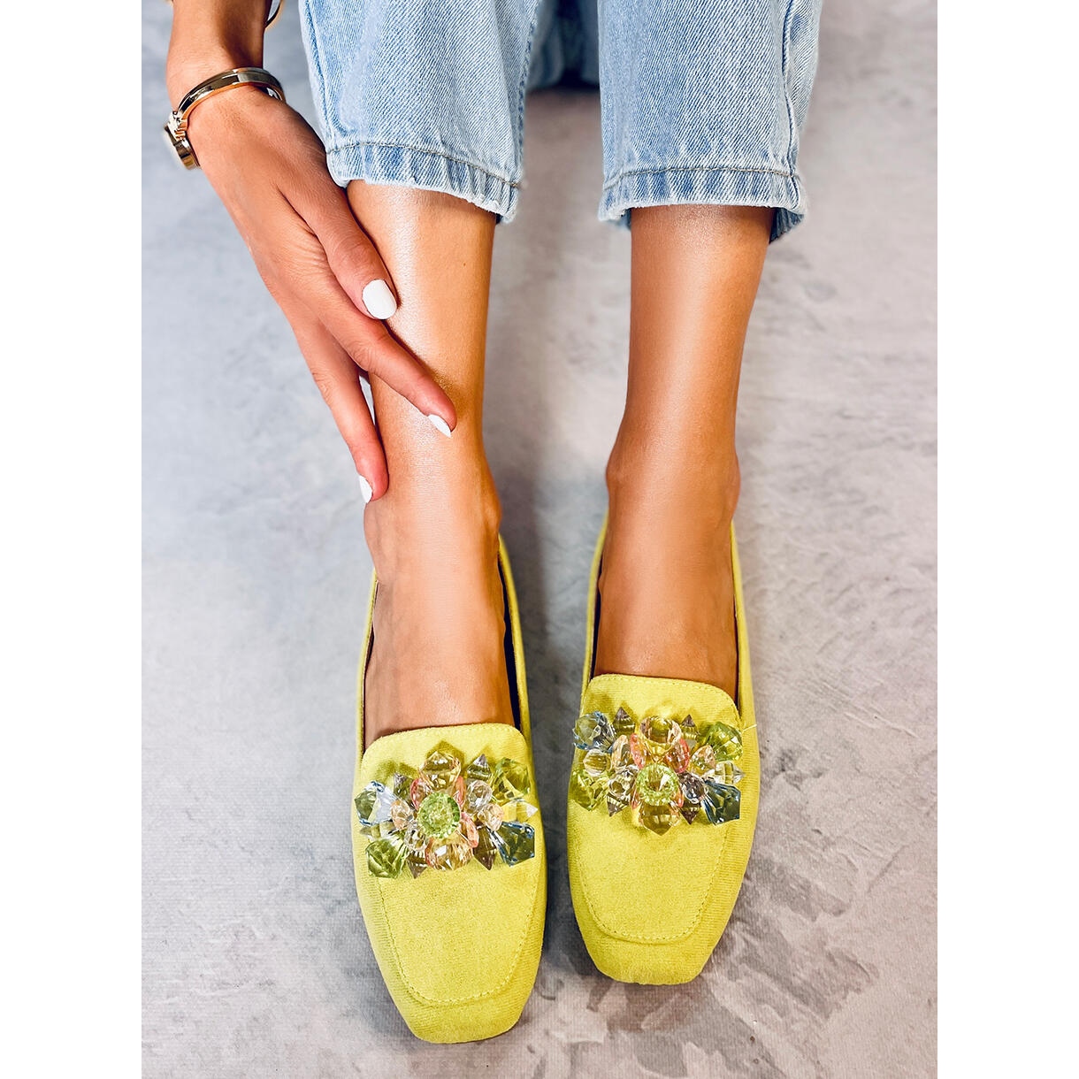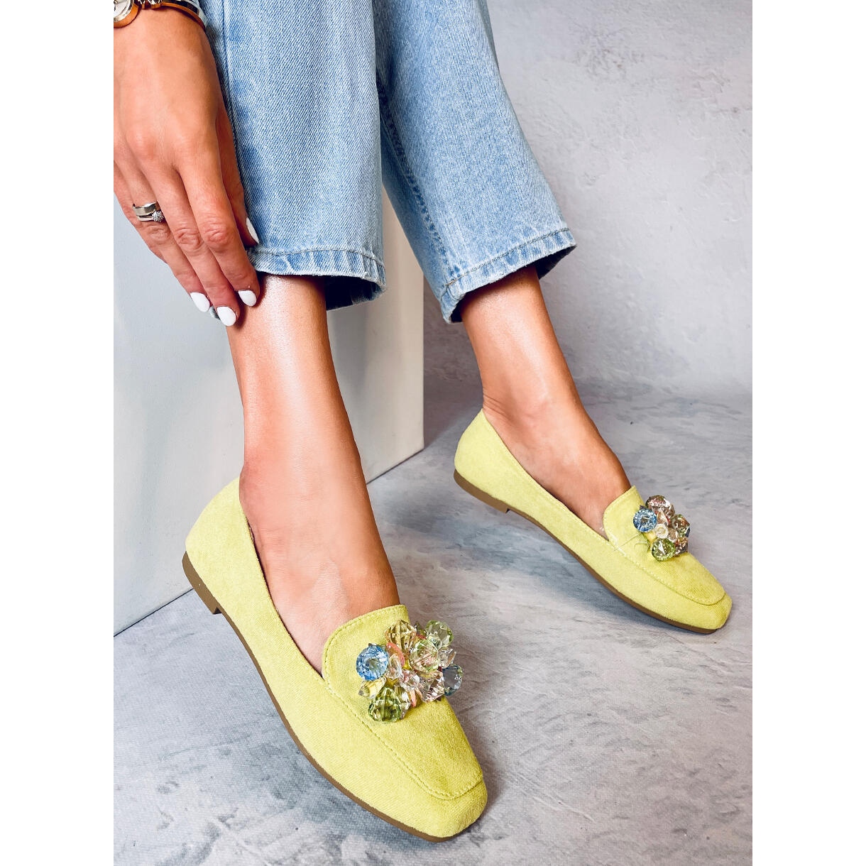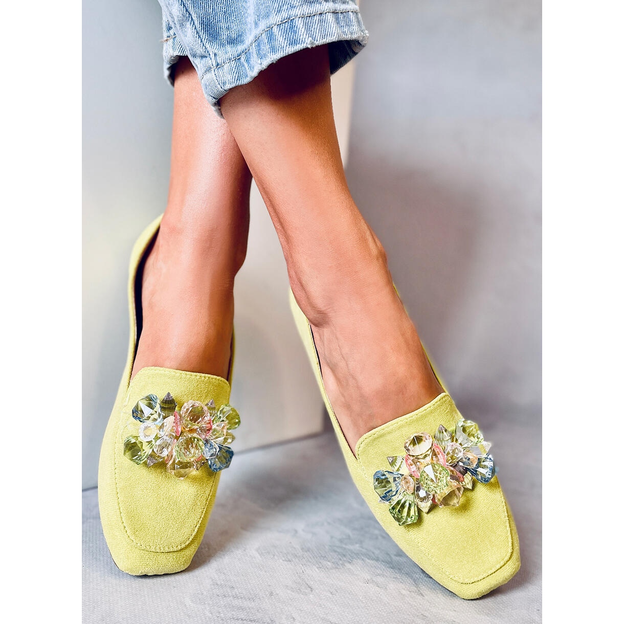 Nous vous présentons les mocassins pour femmes en daim Deley Green, qui correspondent parfaitement aux dernières tendances de la mode. Leur design unique avec des bouts carrés les rend non seulement élégantes, mais aussi confortables. La combinaison d'un design classique avec des pierres brillantes et multicolores leur confère un caractère unique qui attirera certainement l'attention.