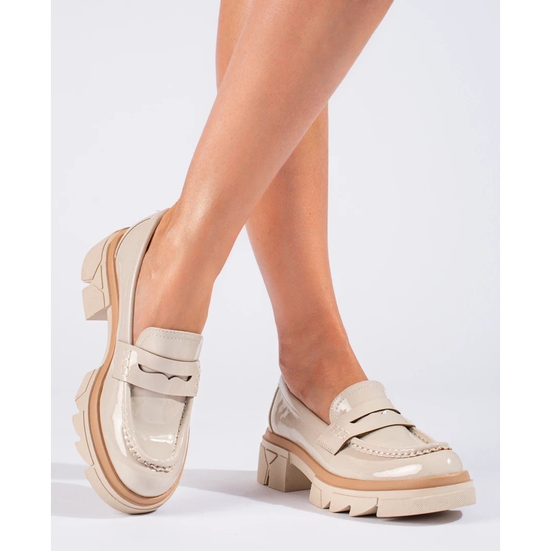 Mandis classiques beige sur la plate-forme Shelovet - Élégance et commodité en un. La nuance universelle de beige et la coupe intemporelle et décontractée font de ces mocassins un complément parfait aux stylisations quotidiennes et plus formelles. La finition verni leur donne une splendeur subtile et 5 cm la plate-forme a optiquement mince la silhouette, tout en maintenant la stabilité et le confort de l'usure.