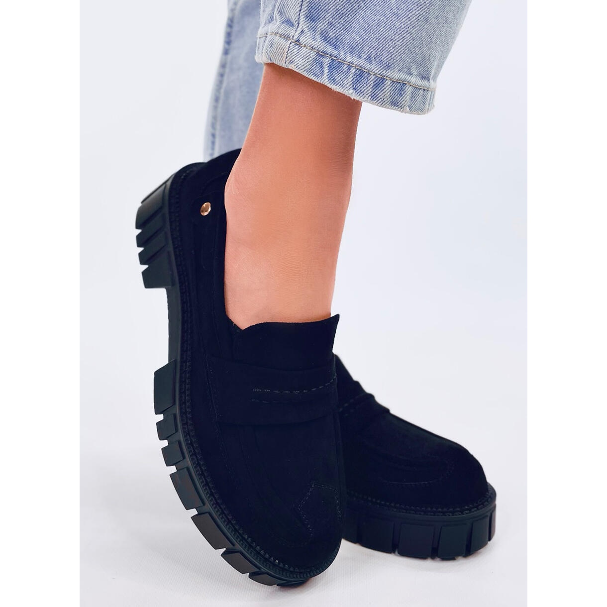 Les mocassins sur la plate-forme Black Chandra sont des chaussures élégantes et élégantes qui deviendront certainement un élément irremplaçable de votre garde-robe. Fabriqués en daim écologique de haute qualité, ils combinent le design à la mode et le confort. Leur semelle massive et plate d'une hauteur de 2,5 cm offre un confort chaque jour, et le nez rond ajoute un personnage classique.