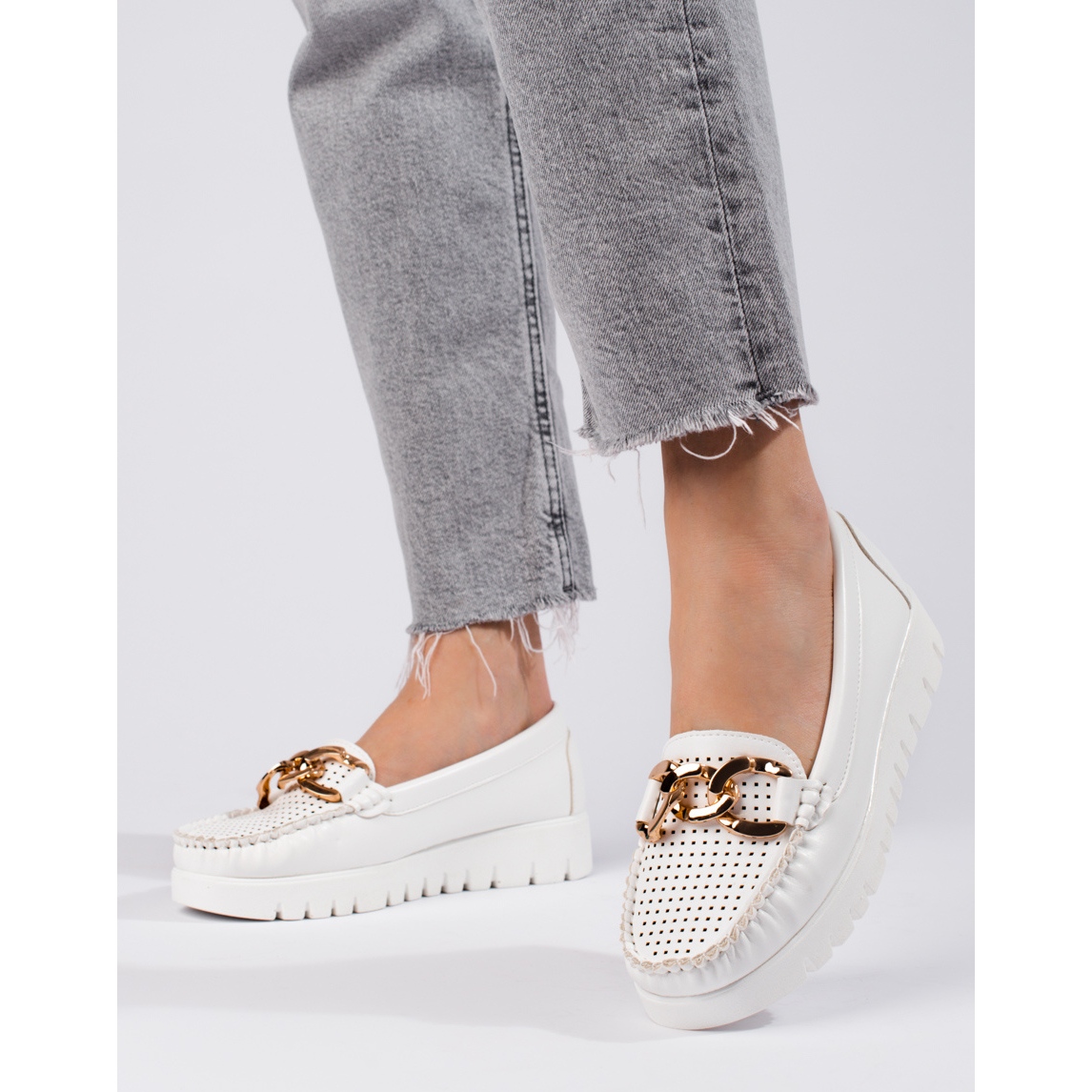 Ces mocassins se distinguent par un talon intégré et souple et un bout rond, qui assurent confort et stabilité au porté. La semelle de 3 cm de hauteur est en plastique, ce qui la rend légère et résistante. Un avantage supplémentaire est le design ajouré et la chaîne décorative, qui confèrent à l'ensemble un caractère unique.