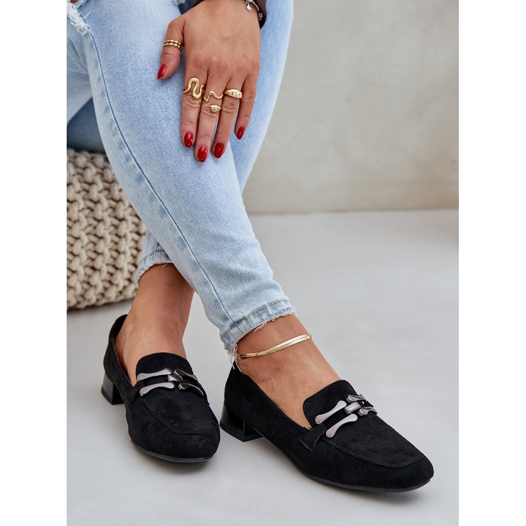 Détails: Mocassins avec un ornement sur un talon délicat eco en daim noir le noir