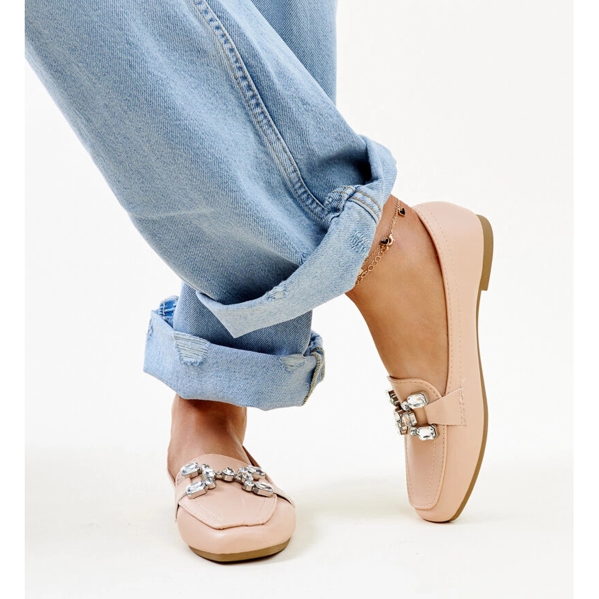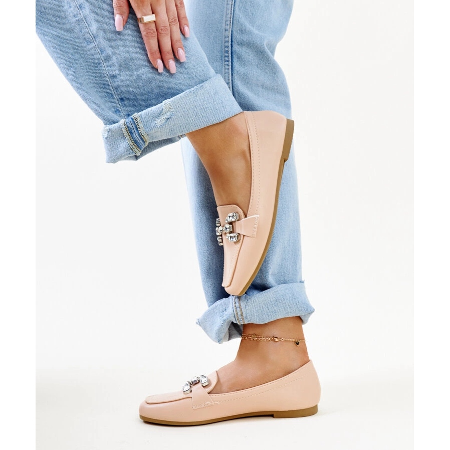Les mocassins beige avec boucle de zirconium sont une excellente proposition pour chaque femme qui veut combiner le confort avec un style élégant. Ces mocassins uniques, caractérisés par un nez carré moderne, ravissent une décoration subtile sous la forme d'une boucle avec des zircons, ce qui leur donne un caractère unique.
