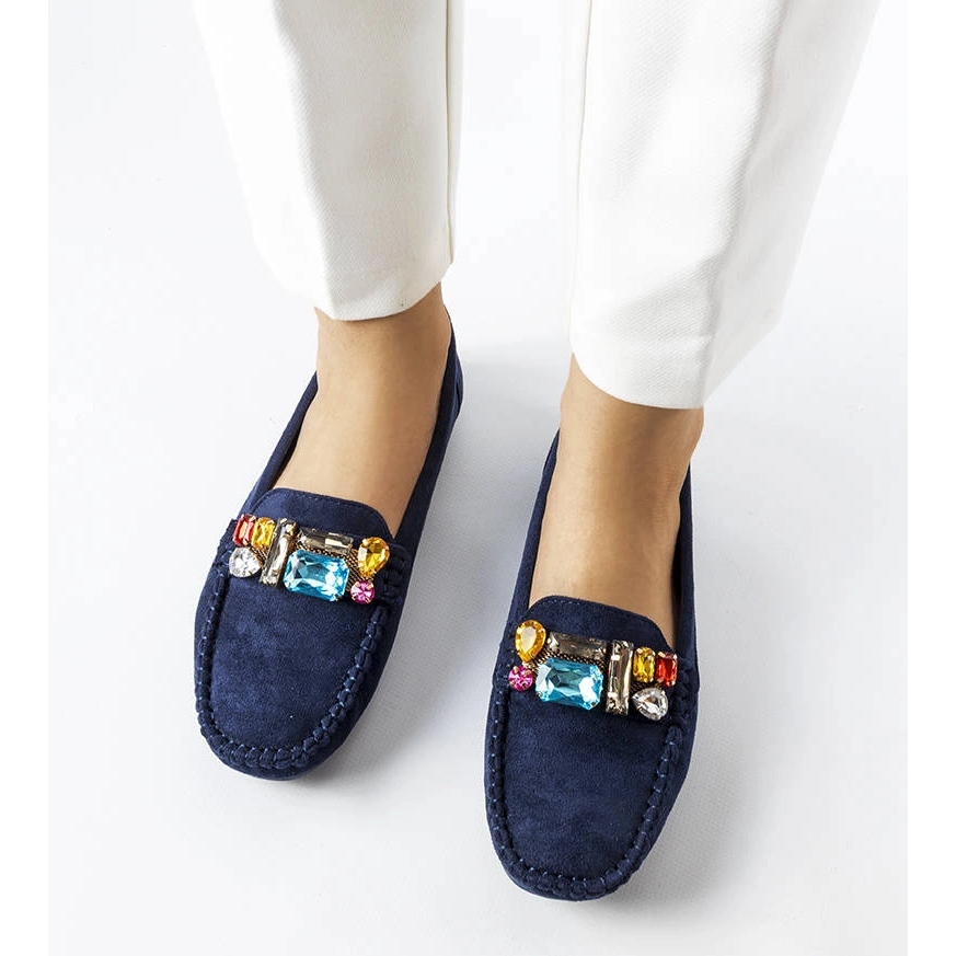 Le produit décrit est un mocassin femme Bertrand de la collection été. Ce sont des chaussures à enfiler de faible hauteur et à bout rond. Les mocassins sont conservés en bleu marine, surmontés de strass bleu clair en plus de la couleur assortie. Elles sont fabriquées en cuir suédé écologique, et leur semelle en caoutchouc est également bleu marine.