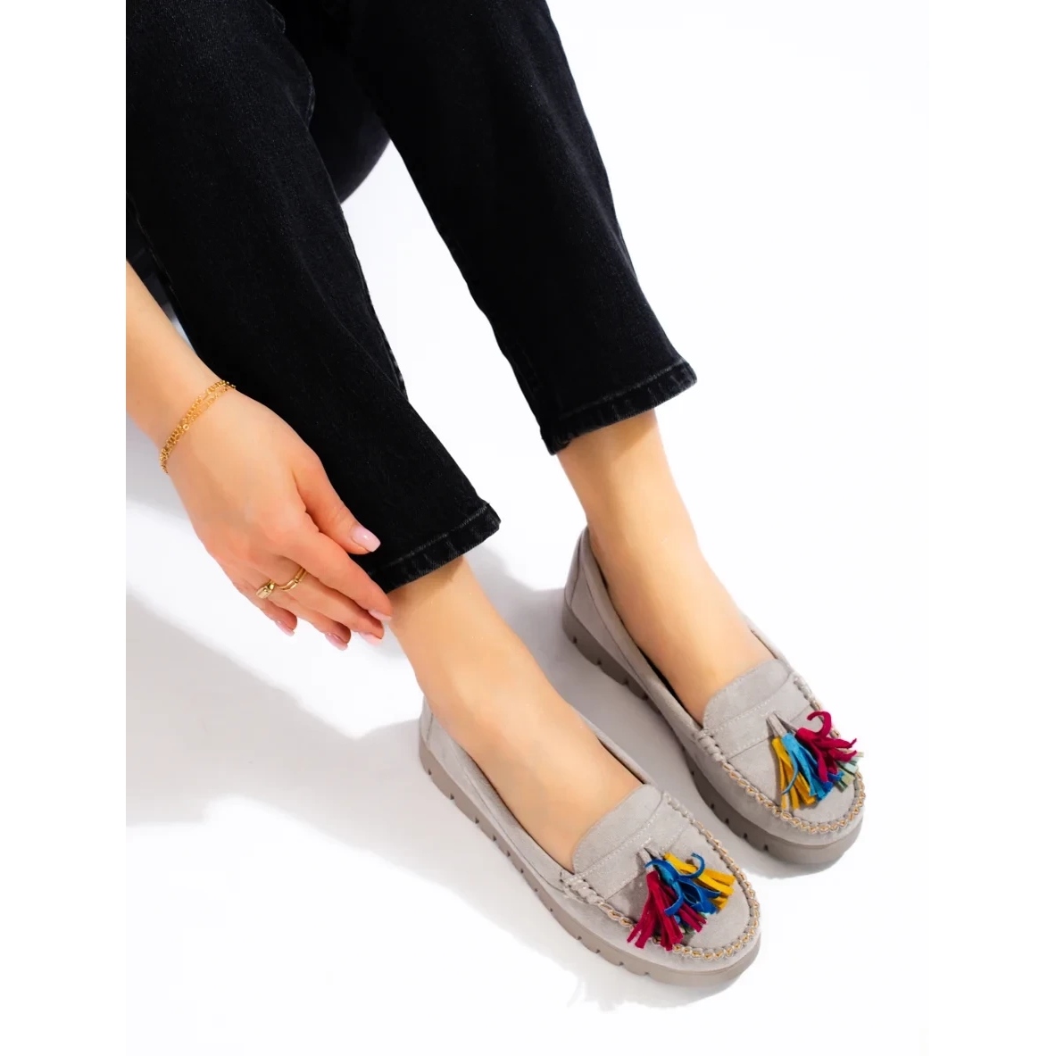Le produit ci-dessous est des mocassins pour femmes de W. Potocki. Ils sont conçus dans un style bohème, avec des franges qui ajoutent du caractère. Ces chaussures sont grises et fabriquées en simili daim de bonne qualité. L'intérieur est doublé de cuir 100 % naturel, ce qui assure un confort de port maximal. Un avantage supplémentaire est la semelle de 3 centimètres en plastique - elle assure la stabilité et la stabilité de la marche. Le style des mocassins peut être décrit comme décontracté et classique. Ils sont parfaits aussi bien pour un usage quotidien que pour les célébrations. Les mocassins sont faciles à enfiler grâce à leur design slip-on. Le produit est neuf, livré dans l'emballage d'origine du fabricant. Ce sont des chaussures parfaites pour la saison printemps/été. Les mocassins n'ont pas de motif dominant. L'offre indique qu'ils font partie de la collection KeeShoes. Le produit est identifié par le code produit BM168202.
