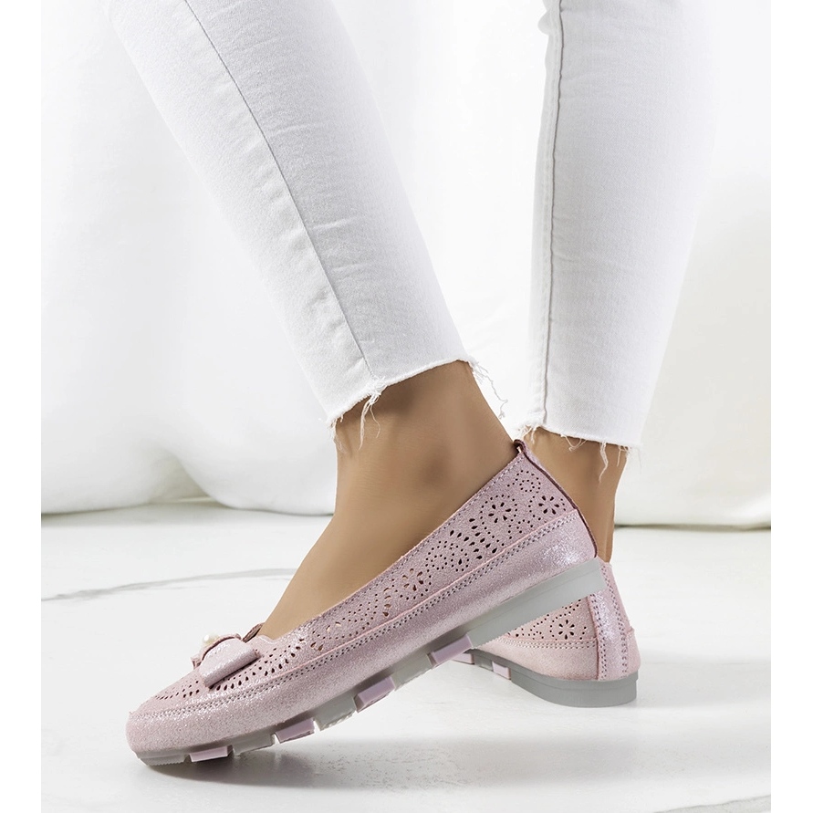 Mocassins élégants de Catane en cuir en daim naturel de haute qualité dans une teinte rose féminine. La tige a été décorée d'un motif de travail ouvert délicat et de particules brillantes, et l'arc décoratif ajoute un charme entier. Un insert en cuir naturel doux et profilé offre un confort même avec une longue usure. Une semelle en caoutchouc gris garantit une bonne adhérence et légèreté. Le modèle à faible coupe est parfait pour les jours chauds - collection d'été.
