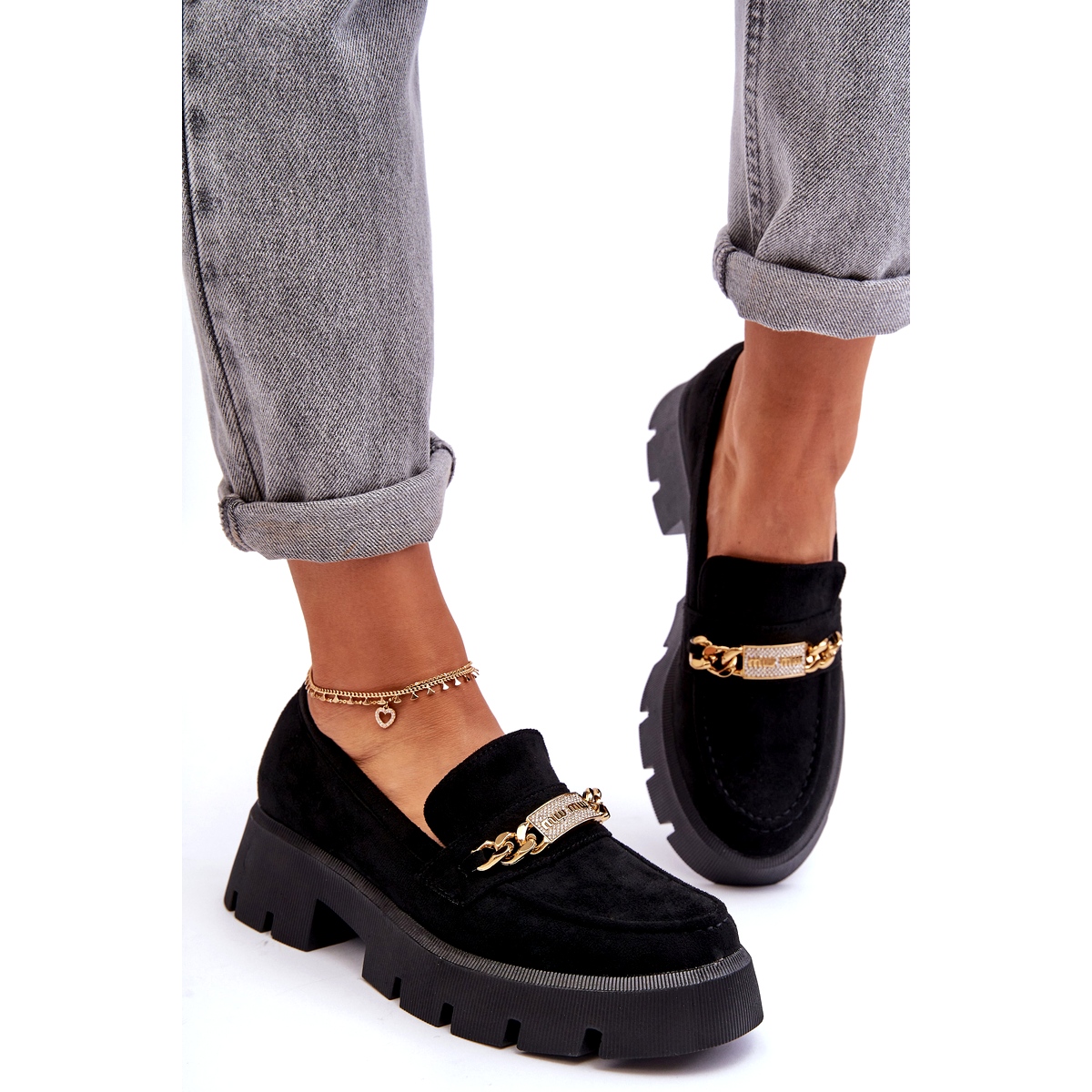 Les mocassins Seastar élégants et confortables combinent une coupe classique avec un accent moderne - une plate-forme massive. Fabriqué en cuir écologique dans une facture en daim, situé sur une plate-forme de 5 cm, ils compléteront parfaitement des ensembles décontractés et plus élégants. Le détail sous la forme d'une chaîne avec une plaque de cuisson décorative et des strass ajoute du caractère et met l'accent sur la nature de la mode des chaussures. Vous devriez avoir ce modèle!