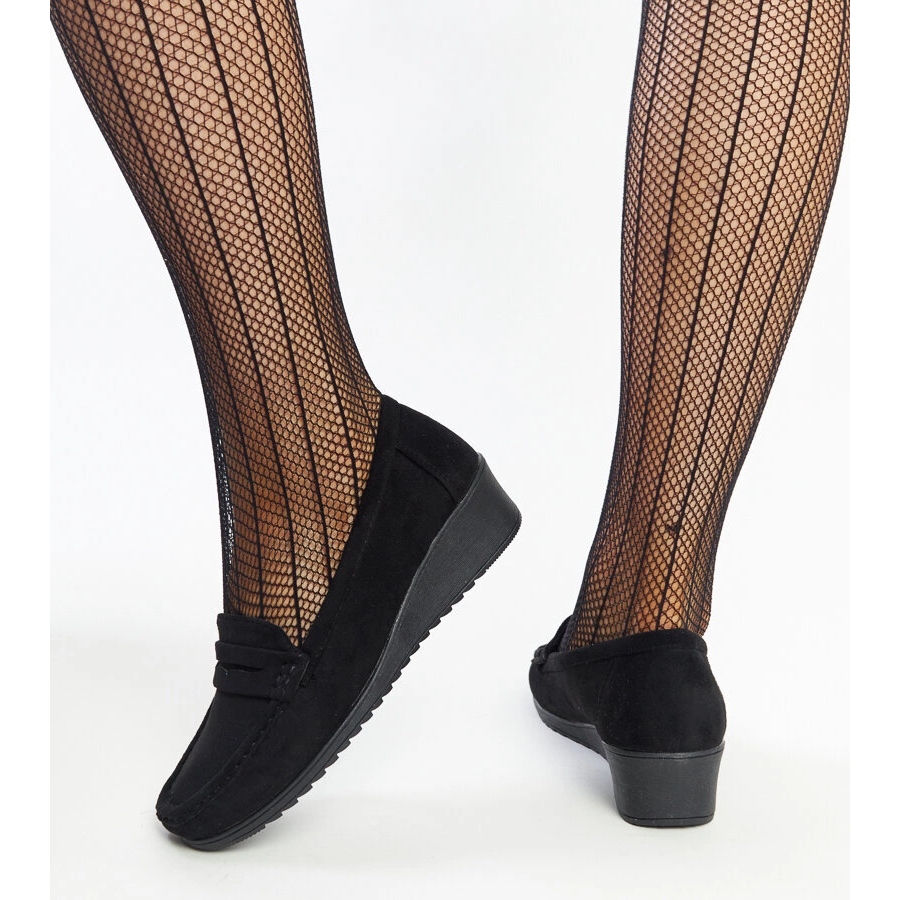 Les mocassins compensés en daim noir sont un élément classique de la garde-robe féminine qui, grâce à la haute qualité de fabrication et à l'apparence élégante, a conquis un large groupe de fans. L'avantage unique de ces chaussures est la possibilité de les porter dans presque toutes les occasions, des courses quotidiennes aux événements plus formels.