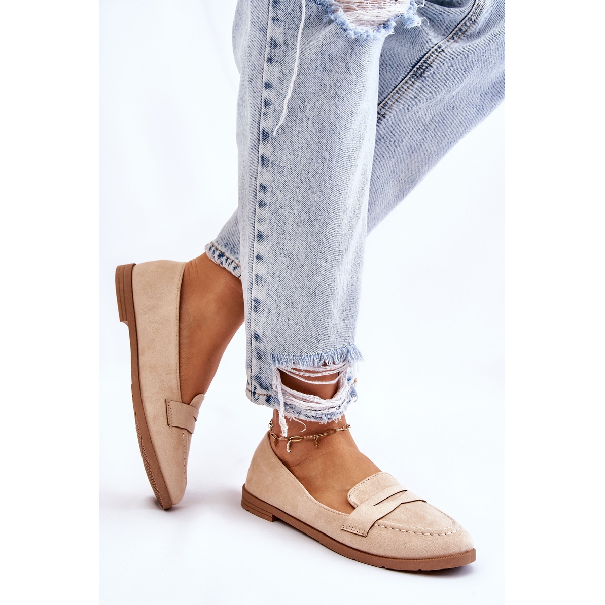 Les mocassins ont une semelle intérieure en cuir écologique avec une perforation délicate, qui affecte la sensation de confort même après une utilisation à long terme. Leur couleur beige universelle les rend parfaits pour de nombreux styles, aussi bien au quotidien que pour des combinaisons plus élégantes.