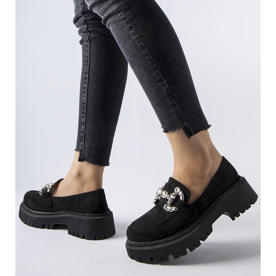 Les strass placés sur la tige ajoutent un éclat subtil à ces mocassins, ce qui en fait le choix parfait pour une variété d'occasions, des réunions informelles aux événements plus formels. Le nez d'amande ajoute une touche d'élégance et la couleur noire se marie bien avec de nombreux styles, offrant polyvalence et charme.