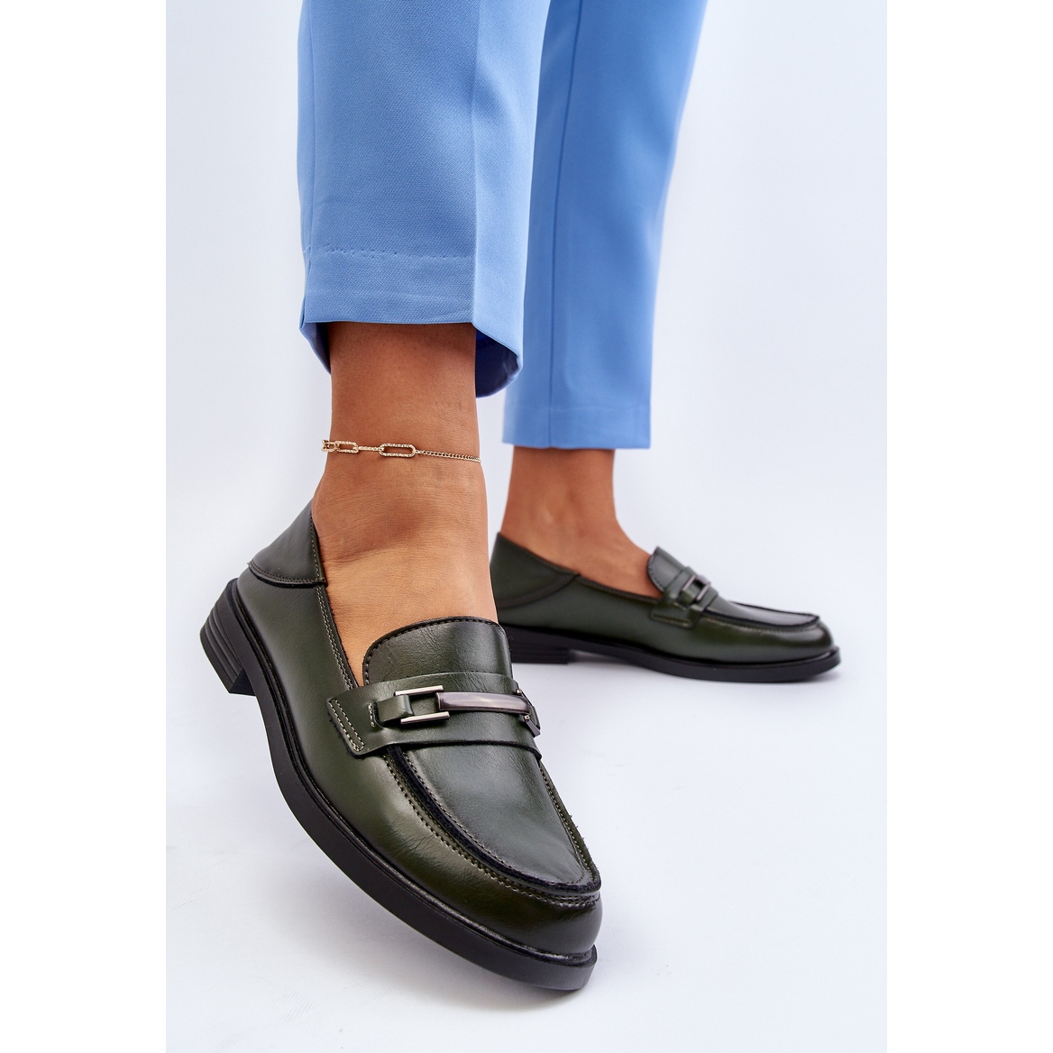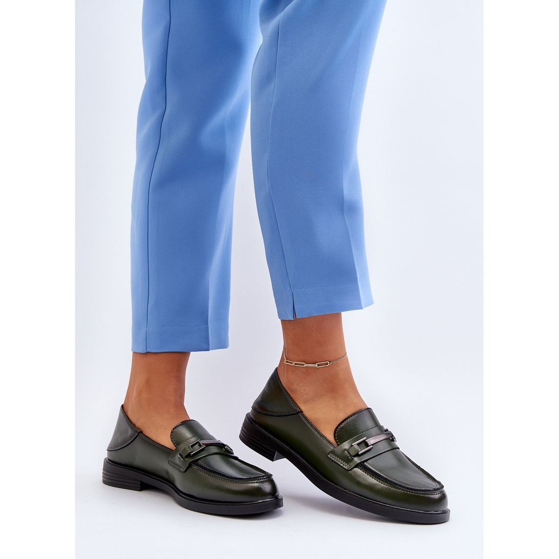 Le modèle vert foncé est un véritable bijou parmi les mocassins. Une décoration caractéristique sous la forme d'une chaîne placée sur le devant de la chaussure ajoute de la classe et rehausse l'esthétique de la fabrication. Les bouts arrondis sont non seulement élégants, mais offrent également un confort aux doigts même pendant de longues périodes d'utilisation. Un talon plat de 3 cm garantit stabilité et confort lors de la marche, ce qui rend ces mocassins parfaits pour les longues promenades ou une journée de travail intense.