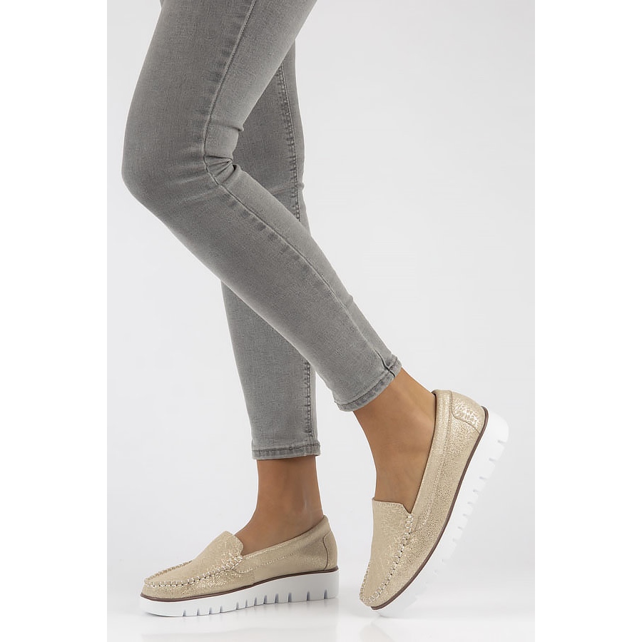 Les mocassins ont une fermeture à enfiler, ce qui les rend faciles à mettre et à enlever. L'intérieur des chaussures est doublé de cuir naturel, assurant un confort de port optimal tout au long de la journée. La hauteur de la plateforme est de 2 cm et la tige de 6 cm, ce qui rend les chaussures non seulement élégantes, mais aussi confortables, parfaites pour les sorties quotidiennes.