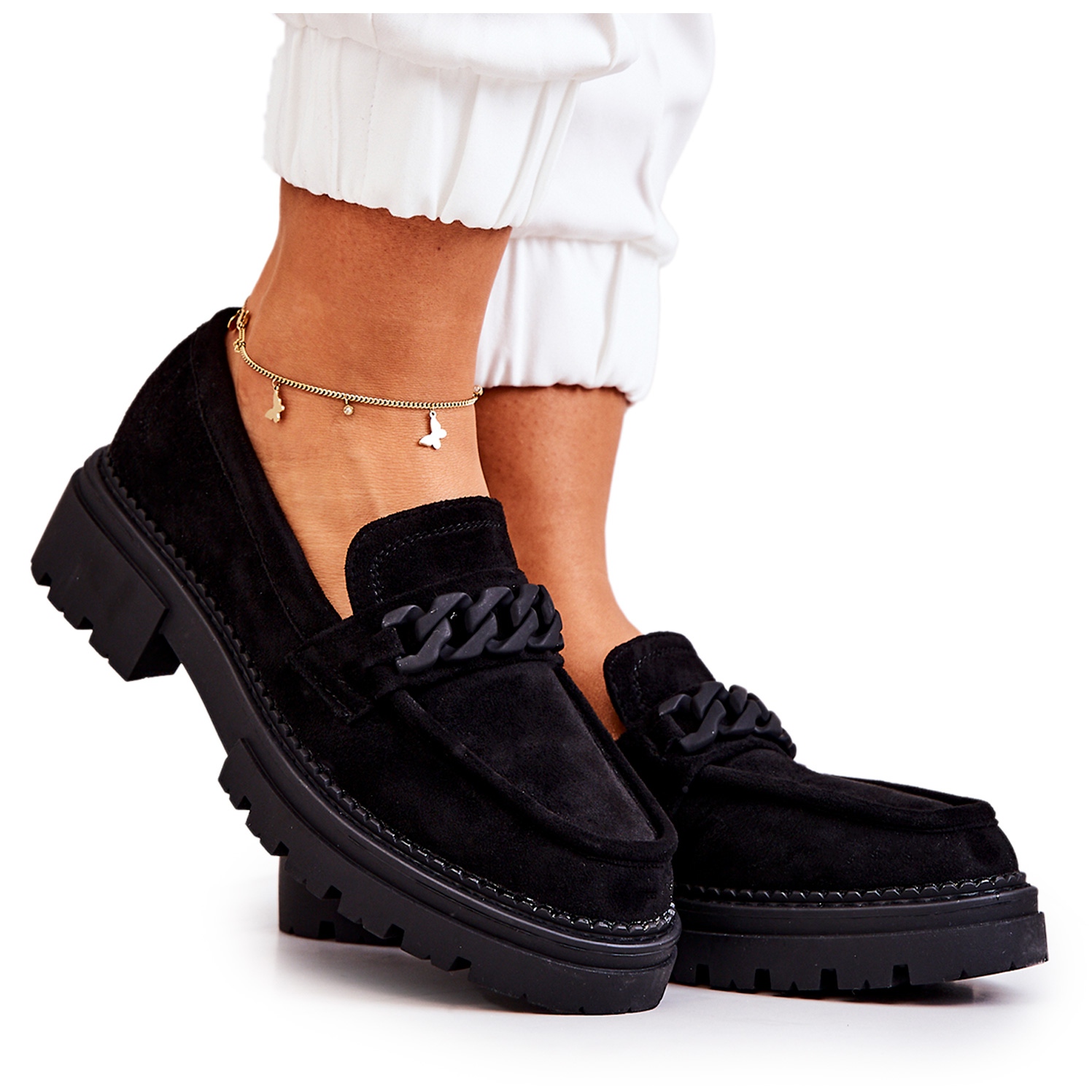 Un élément caractéristique de ce modèle est l'impressionnante décoration en forme de chaîne, qui souligne parfaitement leur style unique, les rendant faciles à intégrer dans de nombreux styles différents, à la fois décontractés et plus élégants. Grâce à la semelle et au talon hauts, les mocassins rehaussent doucement la silhouette, ajoutant ainsi de la confiance en soi.