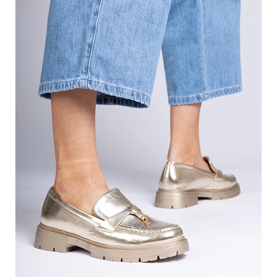 Les mocassins élégants dorés d'éco-cuir sont l'addition idéale pour les femmes qui veulent combiner l'élégance et le confort chaque jour. Le modèle G436 se distingue par une finition vernie dans une couleur dorée spectaculaire, qui attire l'œil et ajoute la splendeur de toute stylisation. Un talon plat avec une hauteur de 4 cm offre une commodité, grâce à laquelle ils sont parfaits pour de longues journées sur lesquelles le confort compte.