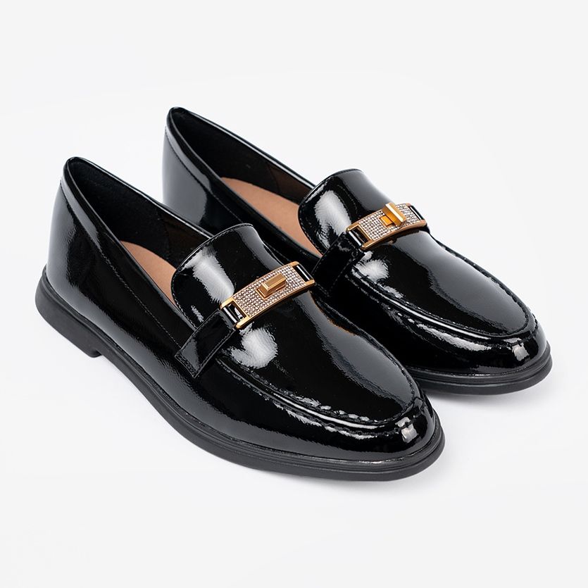 Détails: Shelvt Mocassins élégants vernies avec une décoration dorée le noir