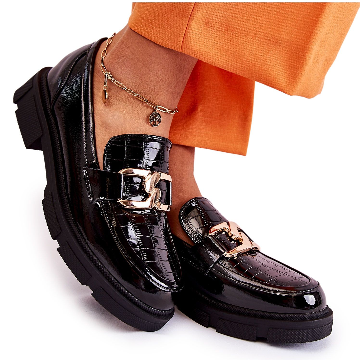 Les chaussures sont montées sur une semelle irrégulière et épaisse avec un talon plat, qui assure stabilité et confort au porté. La hauteur du talon est de 4 cm, tandis que la hauteur supérieure est de 5,5 cm, ce qui permet à ces mocassins d'accentuer subtilement la ligne des jambes. A la hauteur du métatarse se trouve une décoration impressionnante sous la forme d'une chaîne en plastique, ajoutant une touche mode à l'ensemble.