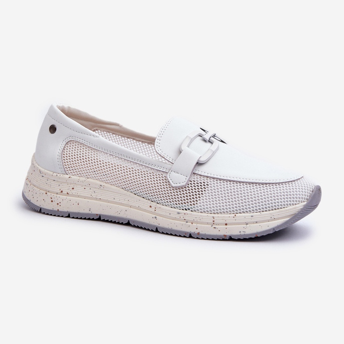 Nous présentons les mocassins en cuir pour femmes S.Barski D&A TW210 dans une couleur blanche élégante. Ces chaussures uniques ont été soigneusement faites de cuir naturel de haute qualité, qui garantit non seulement l'apparence esthétique, mais aussi la durabilité et le confort de l'usure. Le motif perforé sur le matériau rend les mocassins aérés et est excellent les jours plus chauds, permettant la circulation de l'air.