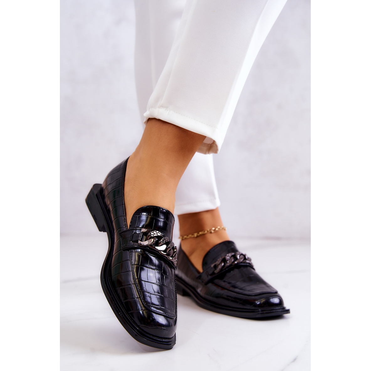 Les mocassins sont ornés d'une chaîne classique, qui leur ajoute élégance et caractère. Fabriqués en cuir écologique, ils sont non seulement à la mode, mais aussi respectueux de l'environnement. La semelle intérieure confortable en cuir naturel rendra certainement chaque pas plus agréable, et la haute qualité des matériaux vous fera en profiter longtemps.