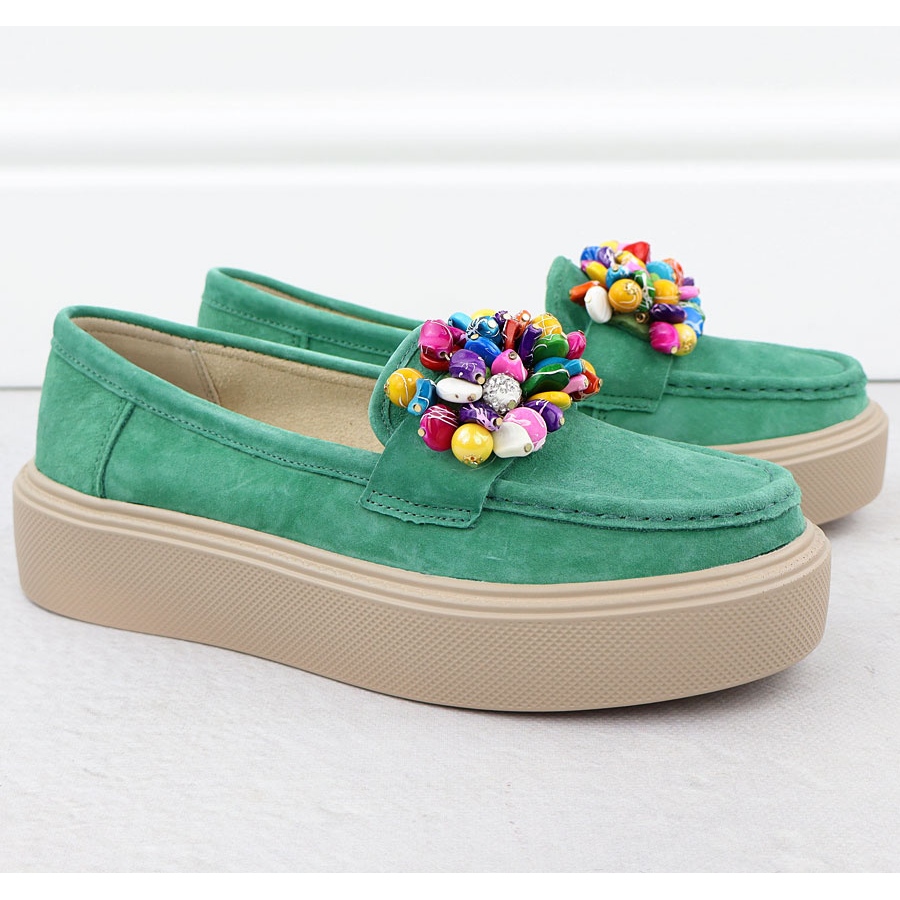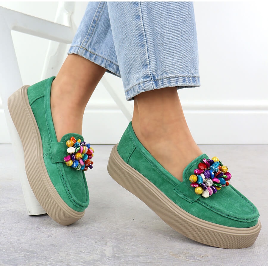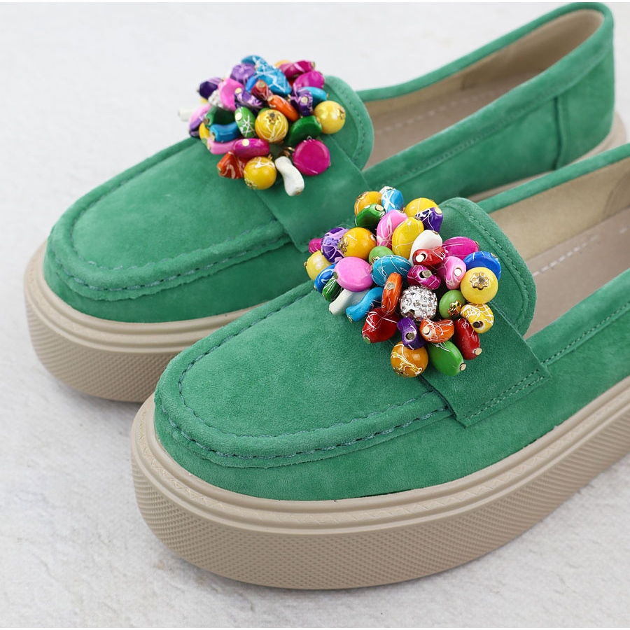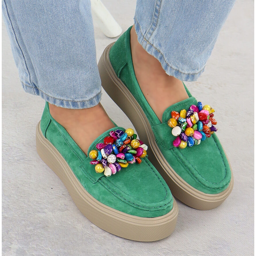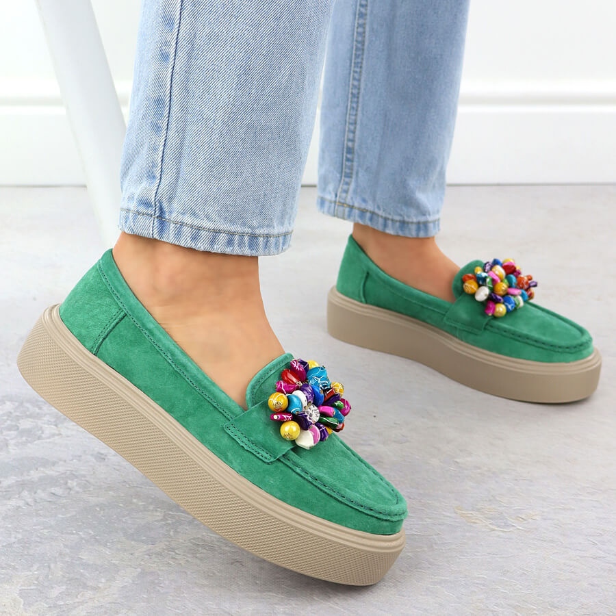L'insert en cuir souple rend chaque pas de plaisir pur, et la bonne épaisseur de la semelle de 3 cm assure un amorti optimal. Les mocassins se caractérisent par une coupe décontractée, idéale pour diverses occasions - à la fois quotidiennement et dans des stylisations plus élégantes. La couleur verte ajoute de la fraîcheur et attire les yeux, et les perles décoratives leur donnent une lueur spéciale.