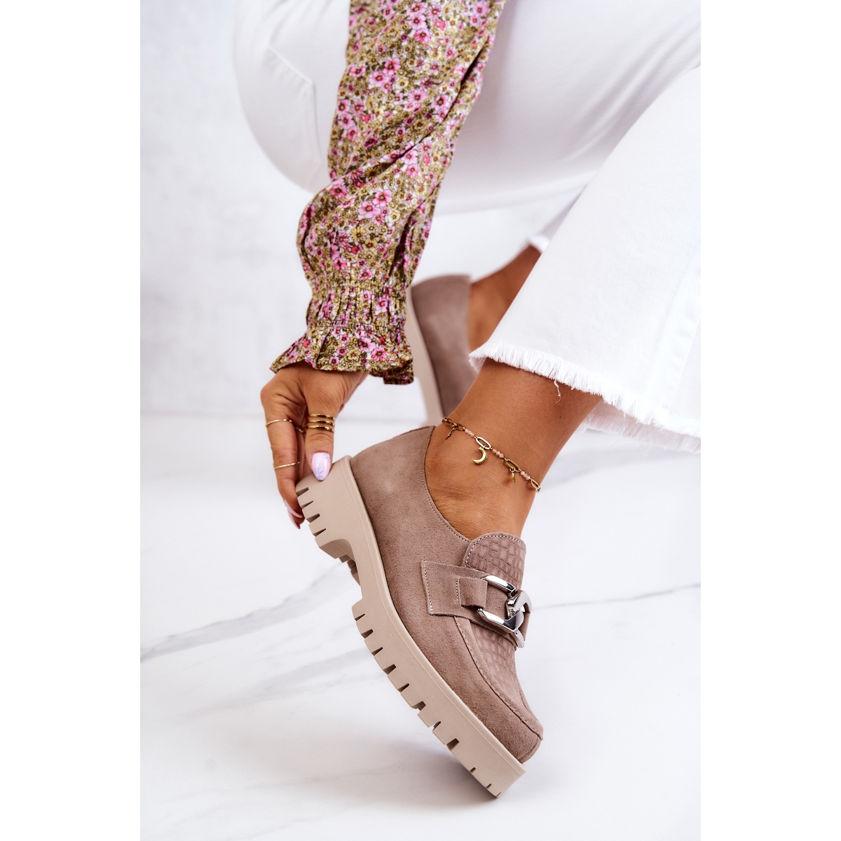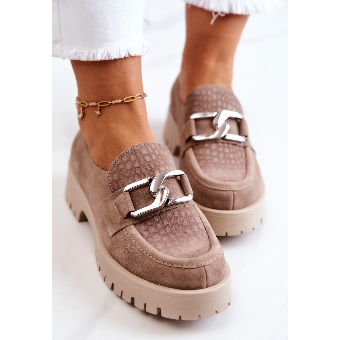 Les mocassins à la mode Rayhan en daim beige foncé sont le choix parfait pour les femmes qui souhaitent allier confort et dernières tendances. Fabriquées en daim naturel de haute qualité, ces chaussures se caractérisent par un bout arrondi et une chaîne décorative de bon goût sur le dessus, ce qui leur confère un caractère unique.
