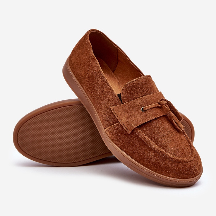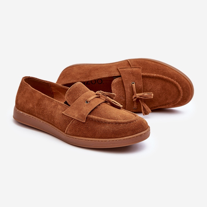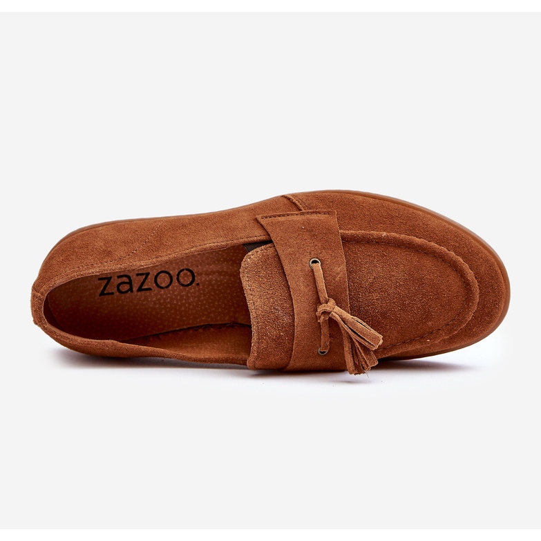 Il s'agit de mocassins pour hommes, fabriqués en cuir suédé marron naturel, de la société polonaise Zazoo. Les chaussures se caractérisent par des bouts légèrement arrondis et une bride décorative à franges sur le devant. Le talon durci assure la stabilité des chaussures et la semelle intérieure en cuir naturel assure un confort de port. Les chaussures sont à enfiler, sans talon, et leur tige mesure 5,5 cm de hauteur. La semelle de 2 cm d'épaisseur est en plastique marron, comme l'ensemble de la chaussure. Le fabricant livre les chaussures dans leur emballage d'origine, non décorées. Les chaussures sont disponibles en plusieurs tailles, du 39 au 45. Le code fabricant est BM185881. Le produit n'a ni doublure ni isolation.
