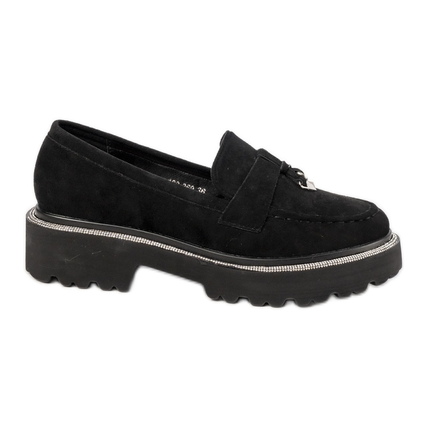 Fabriqué en cuir écologique noir de haute qualité, les mocassins garantissent non seulement une apparence unique, mais aussi la durabilité et le confort. Leurs décorations subtiles avec des zircons et des franges leur donnent un caractère unique, attirant leurs yeux et ajoutant la splendeur à toute stylisation. Une semelle épaisse et récupérée garantit la stabilité, ce qui signifie que ces chaussures sont parfaites pour toute la journée, même lors d'une utilisation intensive.