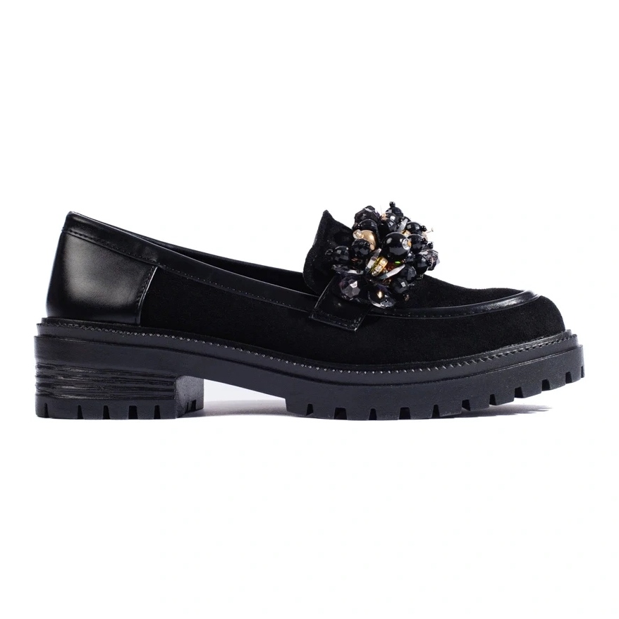 Élégant et confortable - les mocassins Shelovet noirs sont une proposition pour les femmes qui apprécient la combinaison du style urbain avec le confort de porter. Fabriqué en cuir écologique dans une finition en daim, avec un accent délicat sous forme de zircone, fonctionnera pour les stylisations quotidiennes et plus élégantes.