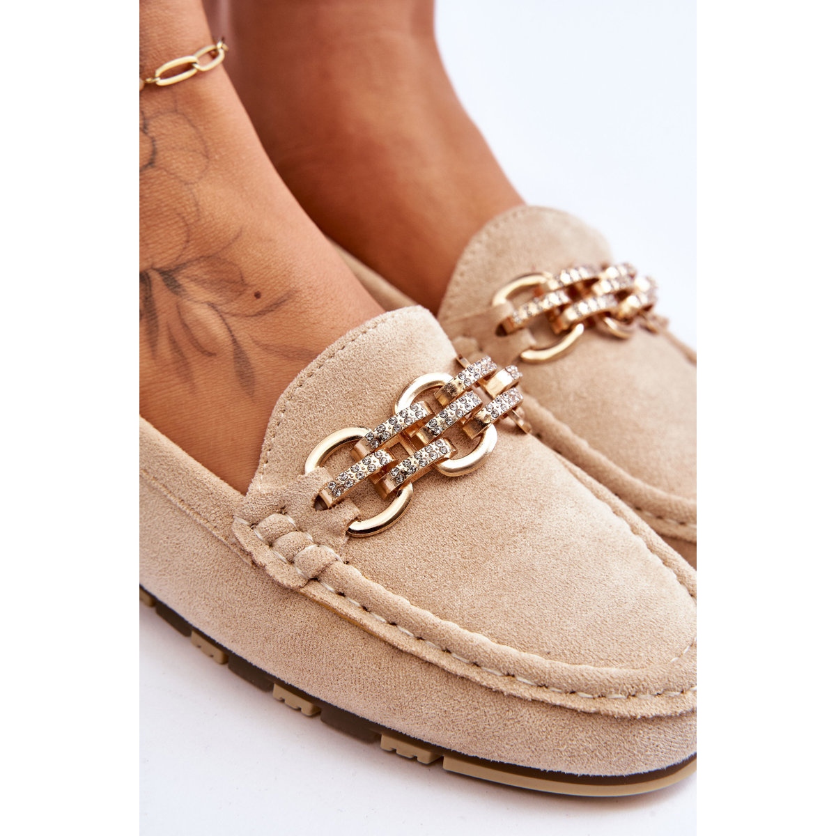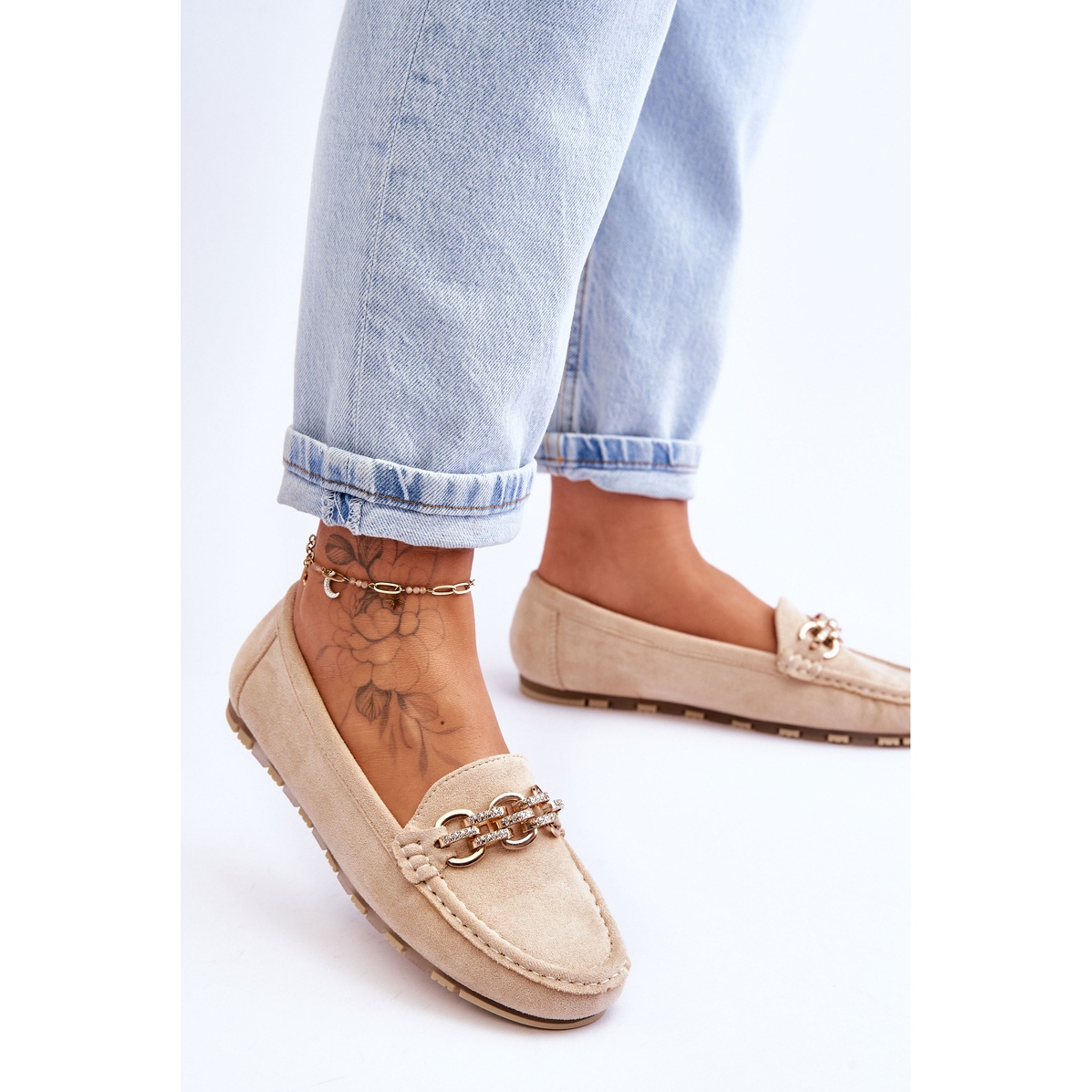 Ces mocassins beiges pour femme sont des chaussures à enfiler élégantes, parfaites pour les mois les plus chauds. Ils sont fabriqués en suède écologique, ce qui prouve leur caractère écologique et leur haute qualité. On retrouve une chaîne décorative avec des strass sur le devant des chaussures, leur donnant un look chic.