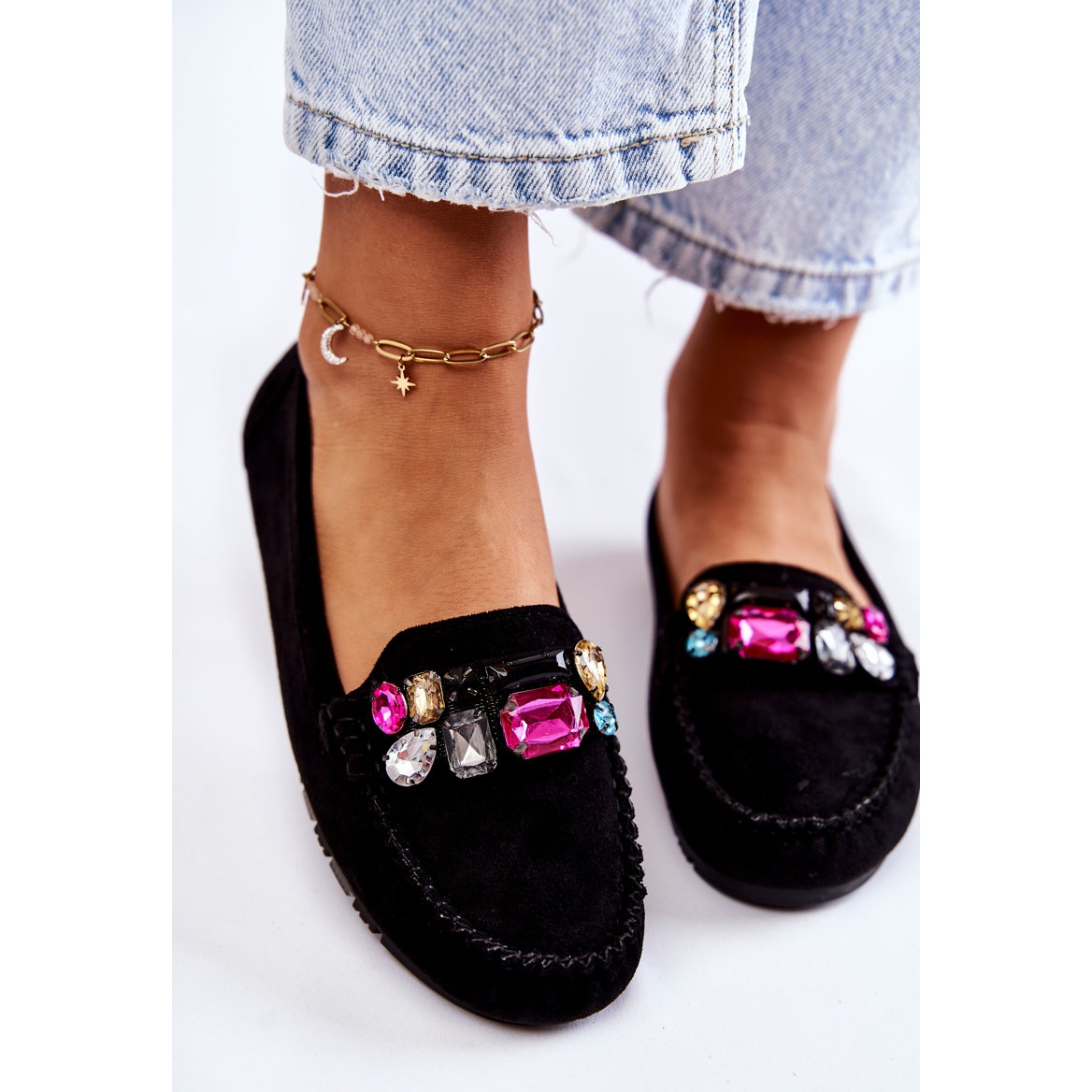 Élégants et confortables - c'est ce que sont les mocassins en daim pour femmes Janetta avec décorations en noir. Fabriqués en éco-daim de haute qualité, ces mocassins offrent non seulement un confort de port, mais aussi un look élégant. Les pierres décoratives sur le devant leur confèrent un charme unique, ce qui les rend parfaites pour de nombreux styles différents.