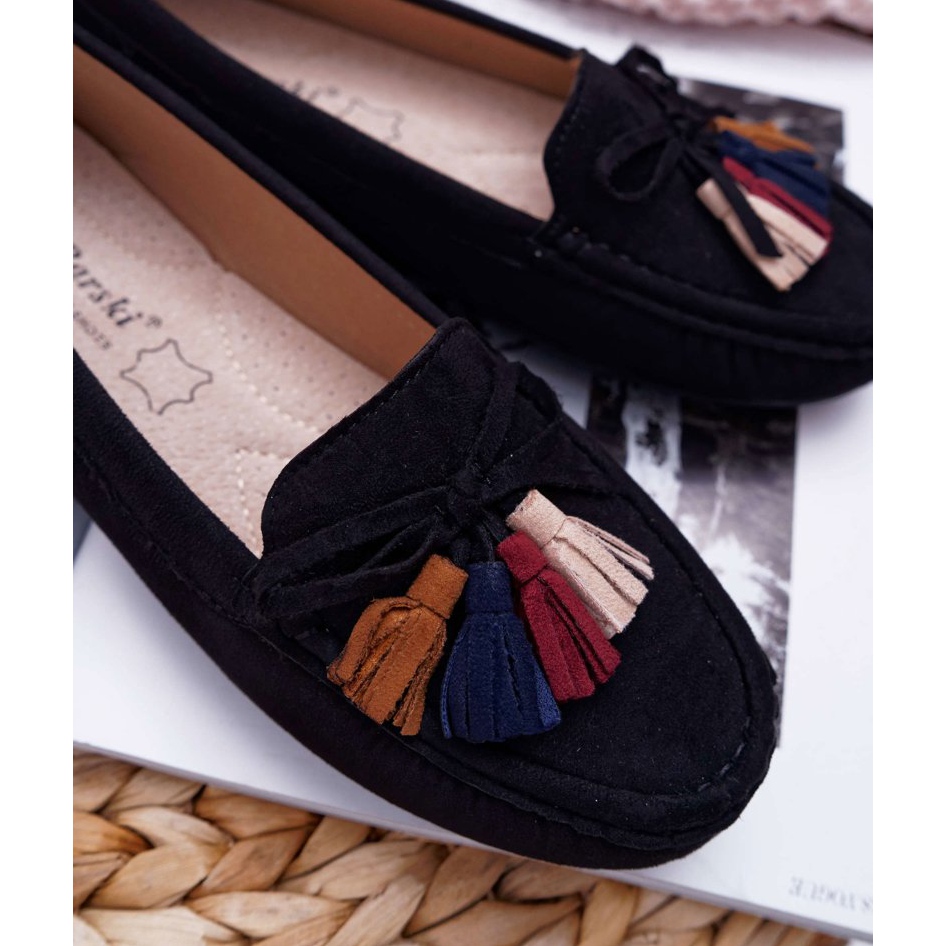 Découvrez les mocassins en daim pour femme noirs S.Barski A199 Mohabe - des chaussures créées pour les femmes qui apprécient le confort et le style intemporel. Fabriqués en éco-daim de haute qualité, ils sont élégants et chics. Le design classique enrichi de franges décoratives sur le nez leur confère un caractère unique, les rendant parfaits aussi bien pour les styles quotidiens que plus formels.