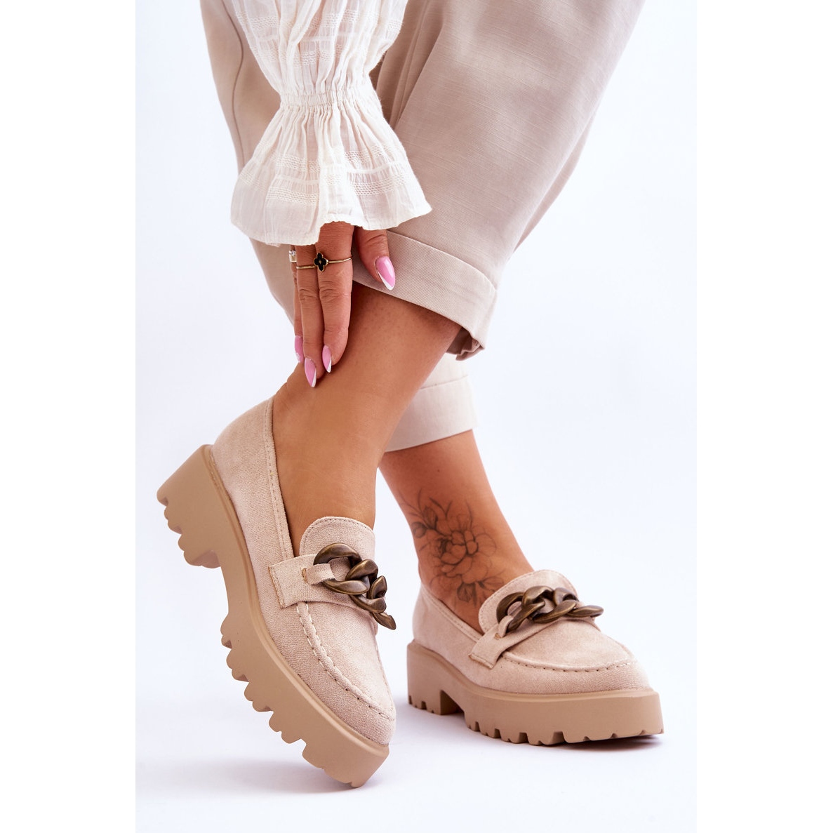 Muisseaux classiques en éco-eco-eco-arbre doux dans une teinte beige universelle (beige avec des accents bruns). Le modèle est décoré d'une chaîne subtile à l'avant, montée sur une semelle stable avec une augmentation délicate (talon de 5,5 cm, plate-forme de 3,5 cm). La structure insérée avec un talon légèrement raidi assure un pliage facile et une bonne prise à pied. L'insert écologique garantit un confort de l'utilisation tout au long de la journée.