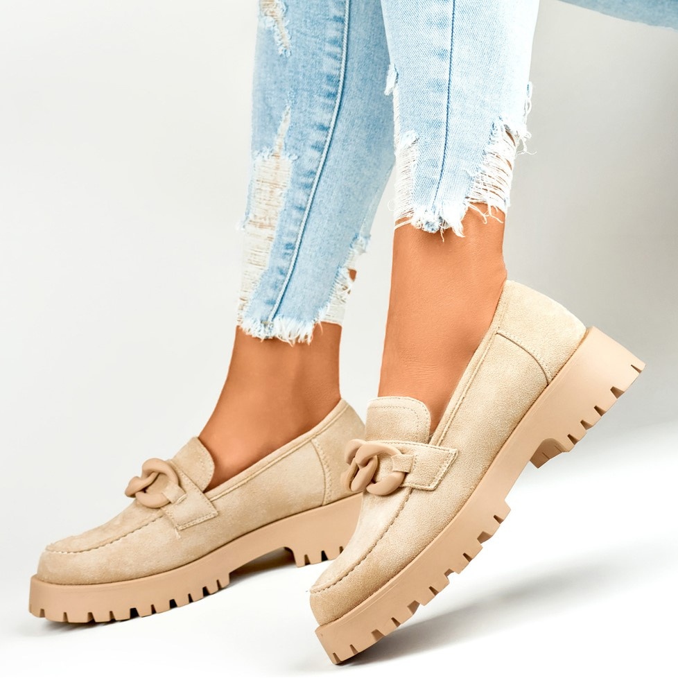 La coupe classique de mobile dans une teinte beige beige chaude a été en daim écologique, ce qui donne l'effet d'une finition mate élégante tout en respectant l'environnement. Le modèle décoré d'une chaîne subtile donne aux chaussures un caractère élégant - idéal pour le bureau et pour rencontrer des amis.