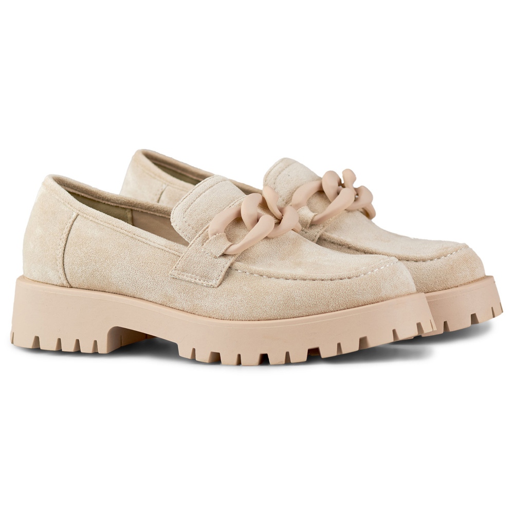- Modèle: Mocassins femme en daim beige avec chaîne
