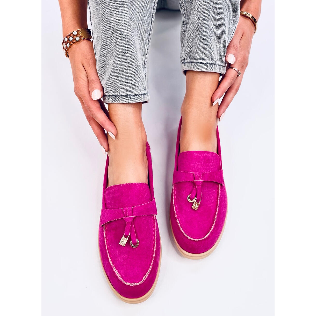 Les mocassins en daim rose sont le choix parfait pour toutes les femmes qui apprécient le style et le confort. Fabriquées en daim écologique, ces chaussures élégantes sont extrêmement impressionnantes grâce à leur coupe classique et leur subtile application dorée qui leur ajoute de l'élégance.