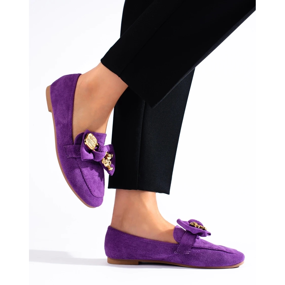 Ce produit est des mocassins violets pour femmes. Les chaussures sont fabriquées en imitation daim de haute qualité, ce qui leur donne un look élégant et confortable à porter. Le bout des mocassins est carré et les mocassins ont une plateforme basse de 1 cm de hauteur. La semelle est en plastique beige.