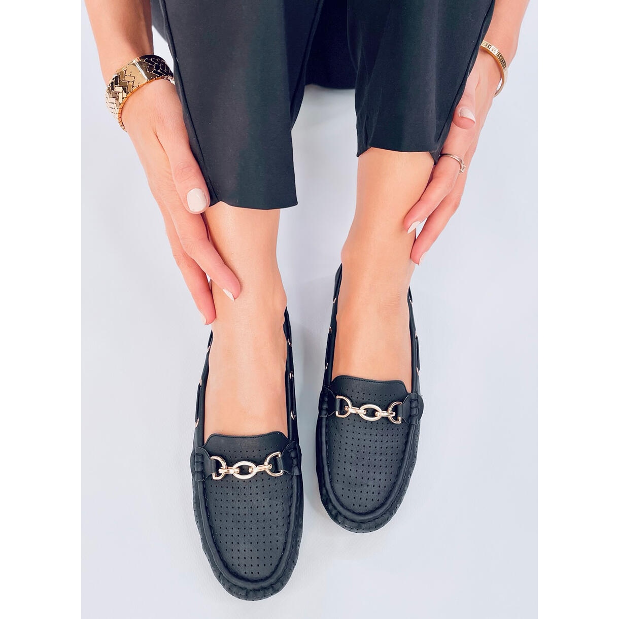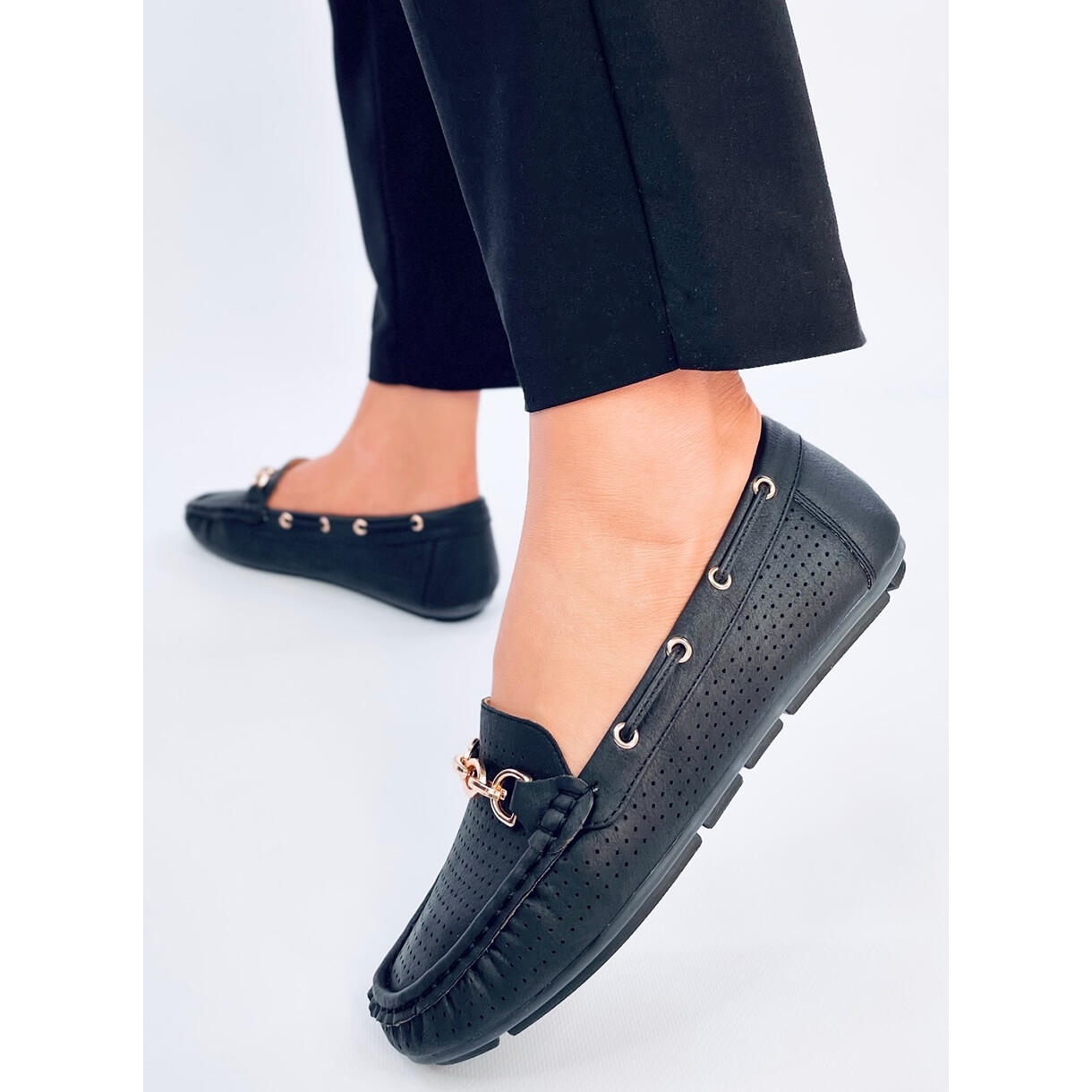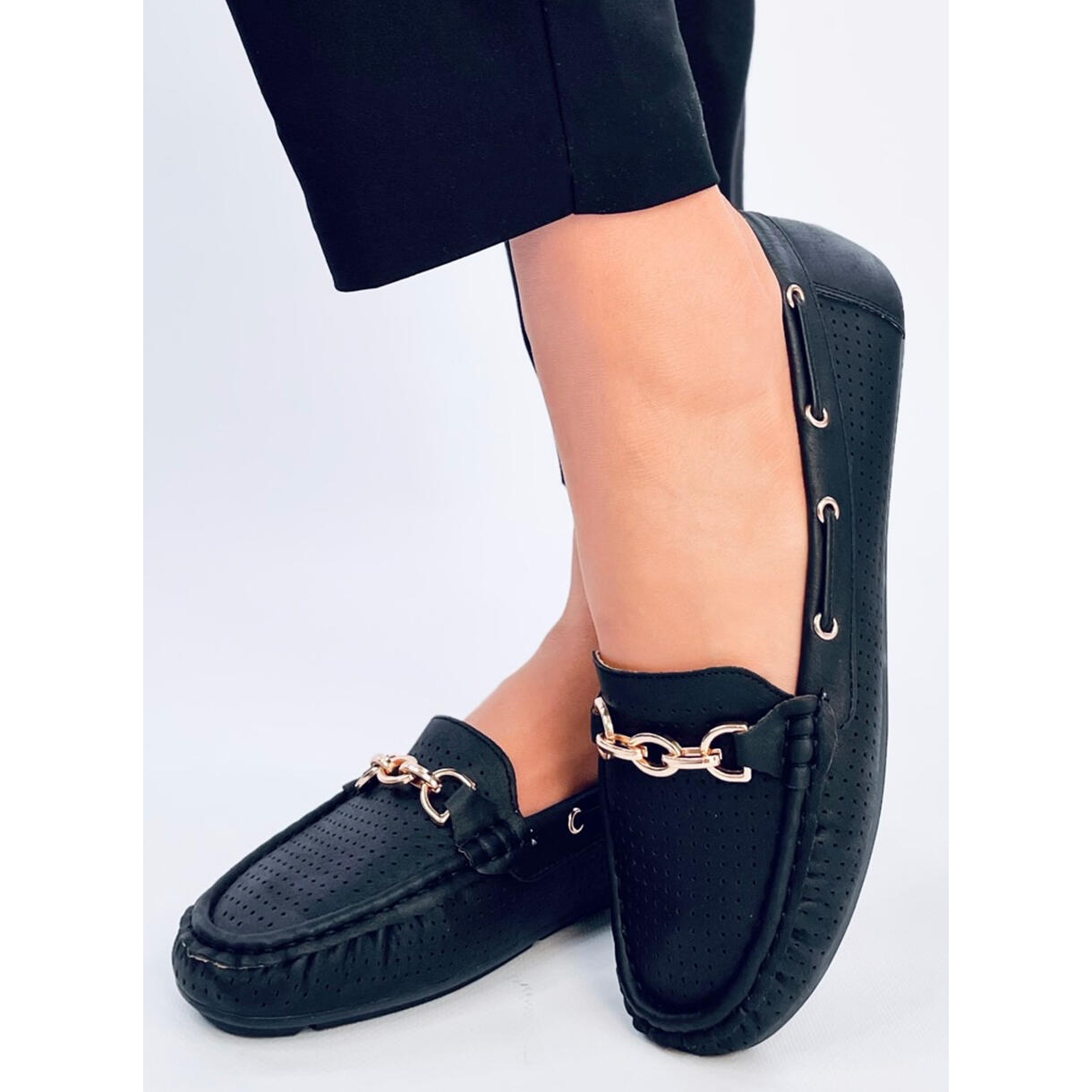 Découvrez l'élégance et la commodité en un! Les mocassins des femmes Nisa Black sont le choix parfait pour toute occasion. Fabriquées en cuir écologique de haute qualité, ces mocassins noirs se distinguent par un motif ouvert, qui offre une excellente respirabilité, et une décoration subtile et dorée leur donne un style unique.